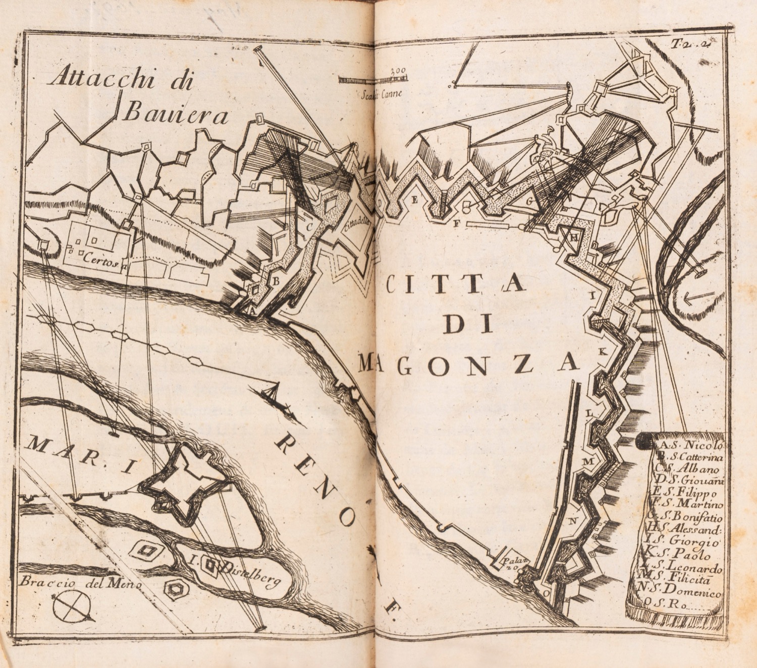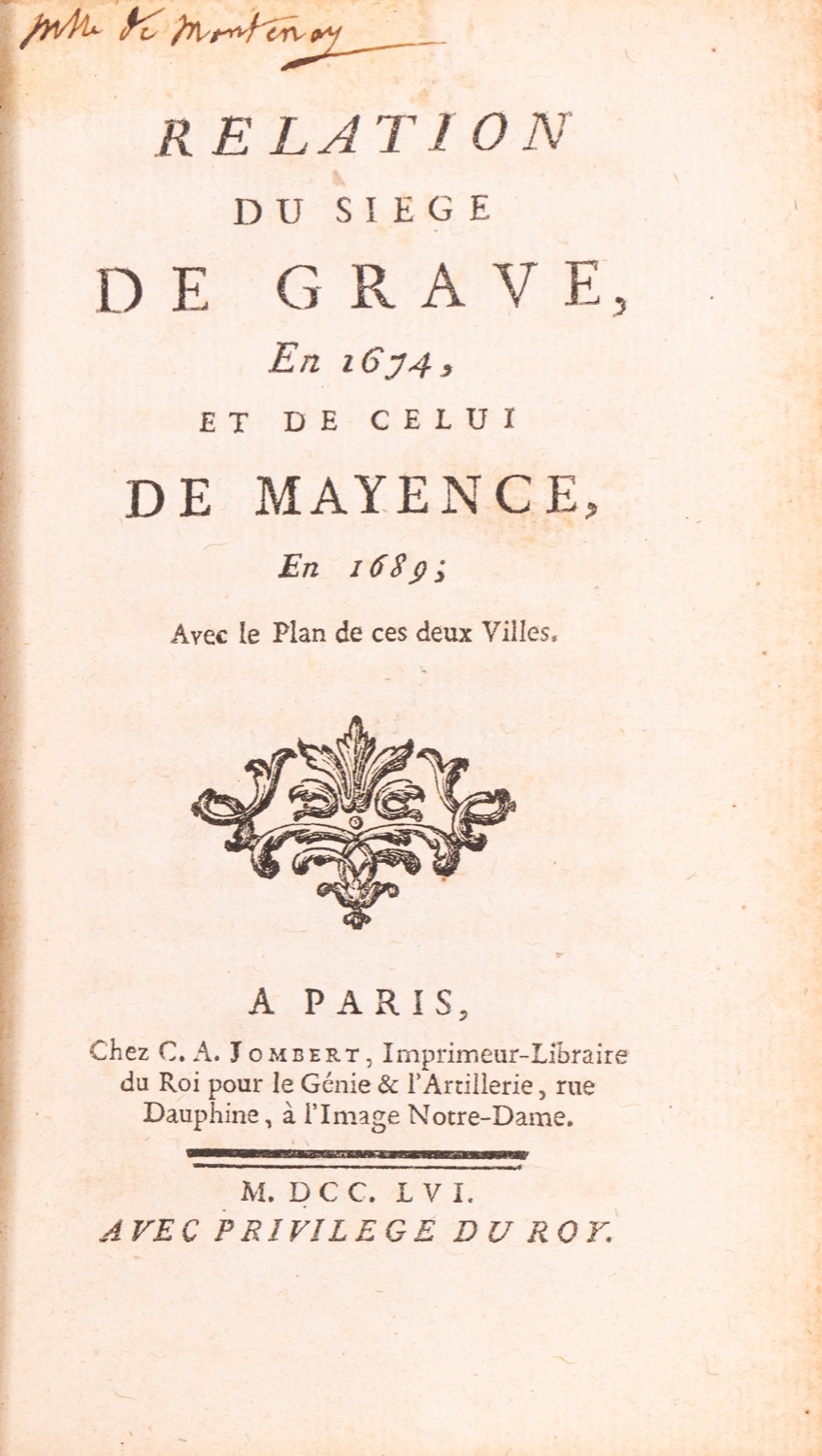 Relation du siege de grave en 1674, et de celui de Mayence en 1689, Parigi, chez C.A. Jombert, 1746. In 12°. Legatura in piena pelle. Dorso con 5 nervi e con titolo e fregi in oro. Tagli in rosso. Sguardie marmorizzate. Testo in francese. Carta geografica della città di Magonza. Piccoli difetti alla legatura.