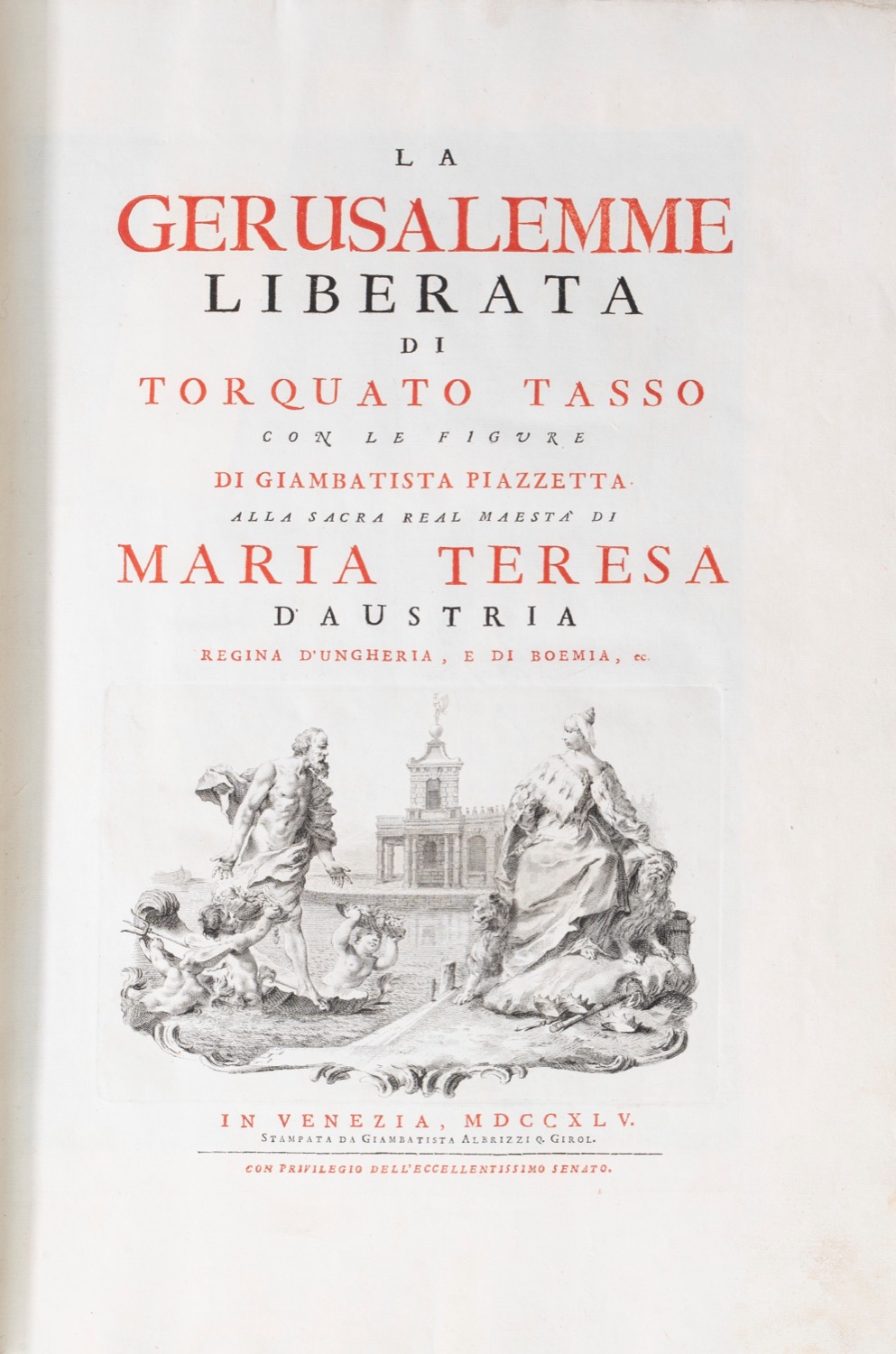 Venezia, stampata da Giambatista Albrizzi q. Girol., 1745. In 2°, 466 x 320 mm. Frontespizio stampato in rosso e nero, vignetta calcografica sul frontespizio raffigurante allegoria della citta di Venezia, ritratto di Maria Teresa 'giovane' disegnato da Piazzetta e inciso da Polanzani, ogni canto (20) preceduto da una superba carta di tavola con stemma e dedica a personaggi sempre differenti, 20 vignette di testa che racchiudono l'Argomento dei Canti poggianti su mensole rococò, 20 culs-de-lampe (di cui 6 a piena pagina), 21 capilettera istoriati, ESEMPLARE PERFETTO E FRESCHISSIMO della prima edizione, genuina, ben distinguibile dalla contraffazione ora attribuita a Zatta. Cartonatura originale, titolo manoscritto al dorso, chemise in mezzo marocchino rosso e astuccio.