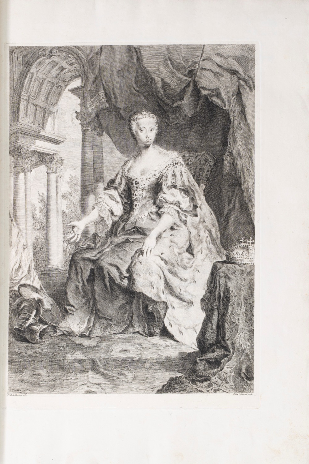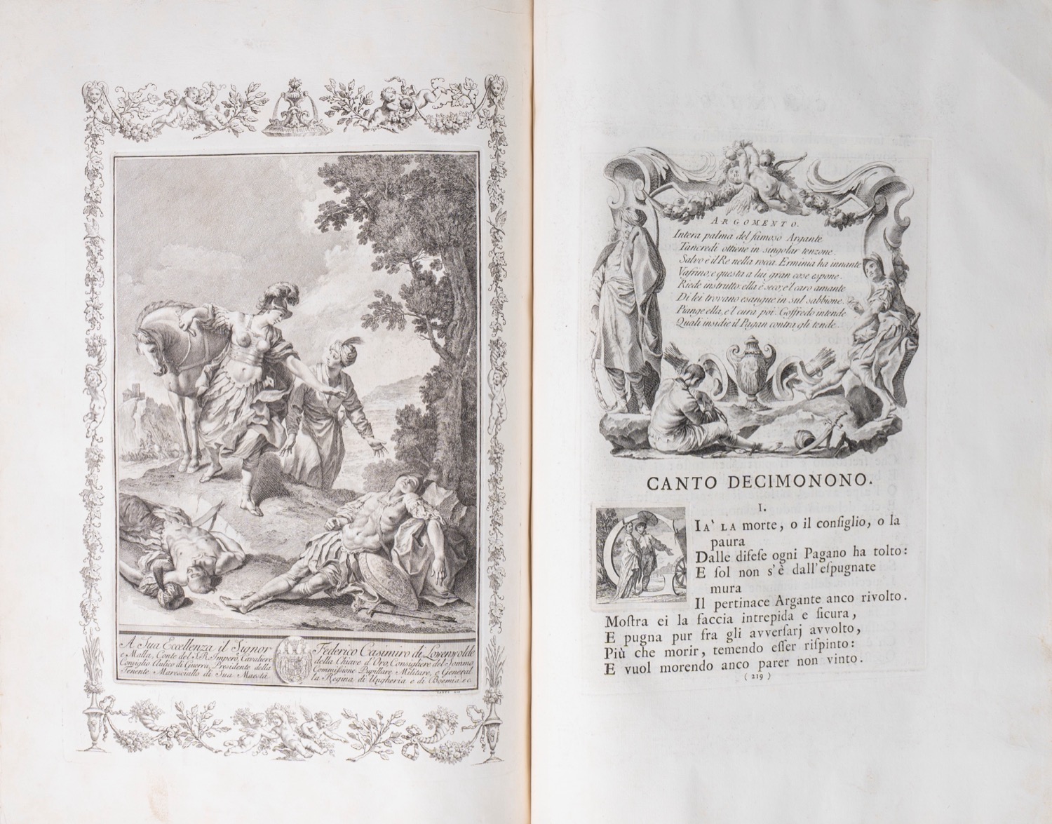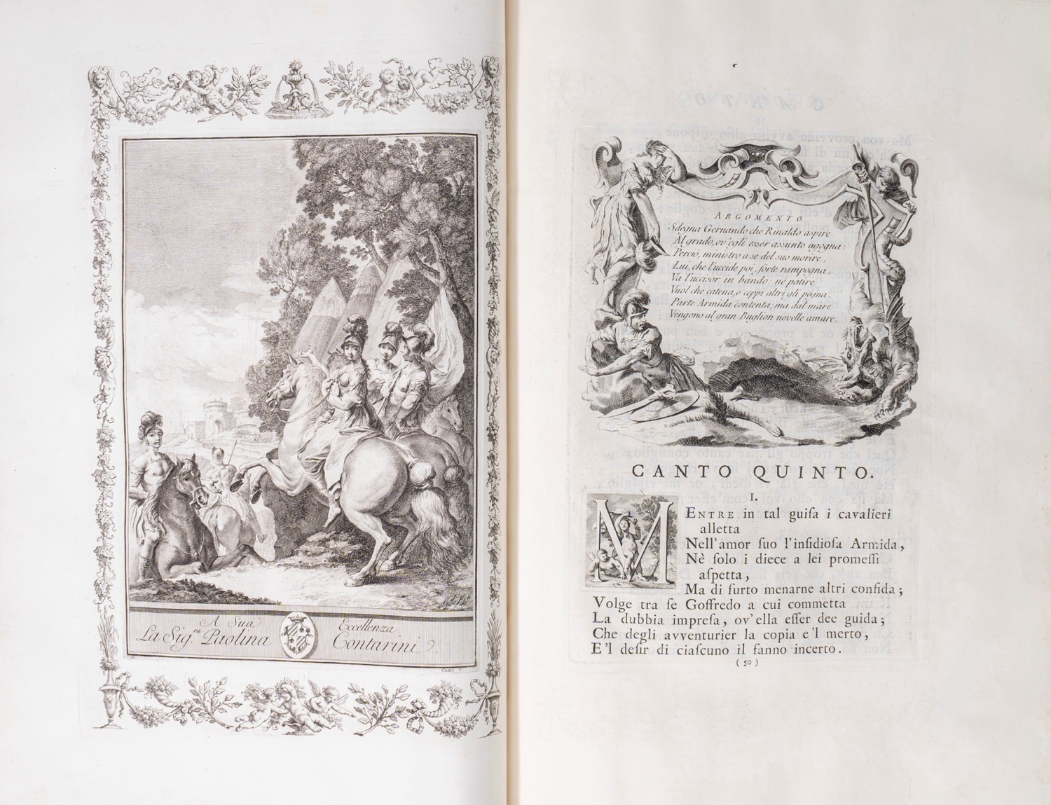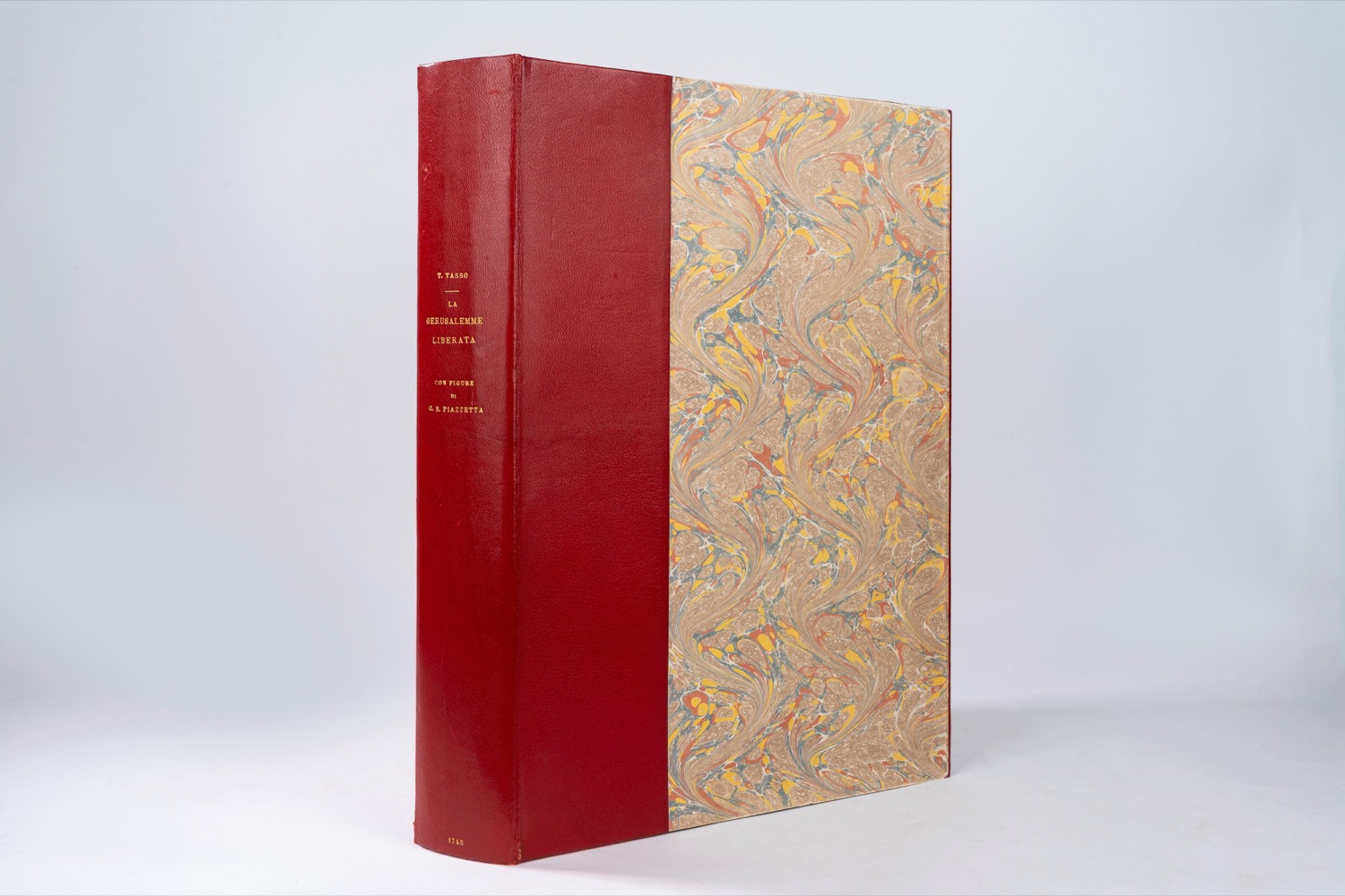 Provenienza: D.V.A. Platzaert (sec.XVIII); "Il Marchese di Livorno" (fine sec.XVIII). Venezia, stampata da Giambatista Albrizzi q. Girol., 1745. In 2°, 466 x 320 mm. Frontespizio stampato in rosso e nero, vignetta calcografica sul frontespizio raffigurante allegoria della citta di Venezia, ritratto di Maria Teresa 'giovane' disegnato da Piazzetta e inciso da Polanzani, ogni canto (20) preceduto da una superba carta di tavola con stemma e dedica a personaggi sempre differenti, 20 vignette di testa che racchiudono l'Argomento dei Canti poggianti su mensole rococò, 20 culs-de-lampe (di cui 6 a piena pagina), 21 capilettera istoriati, ESEMPLARE PERFETTO E FRESCHISSIMO della prima edizione, genuina, ben distinguibile dalla contraffazione ora attribuita a Zatta. Cartonatura originale, titolo manoscritto al dorso, chemise in mezzo marocchino rosso e astuccio.