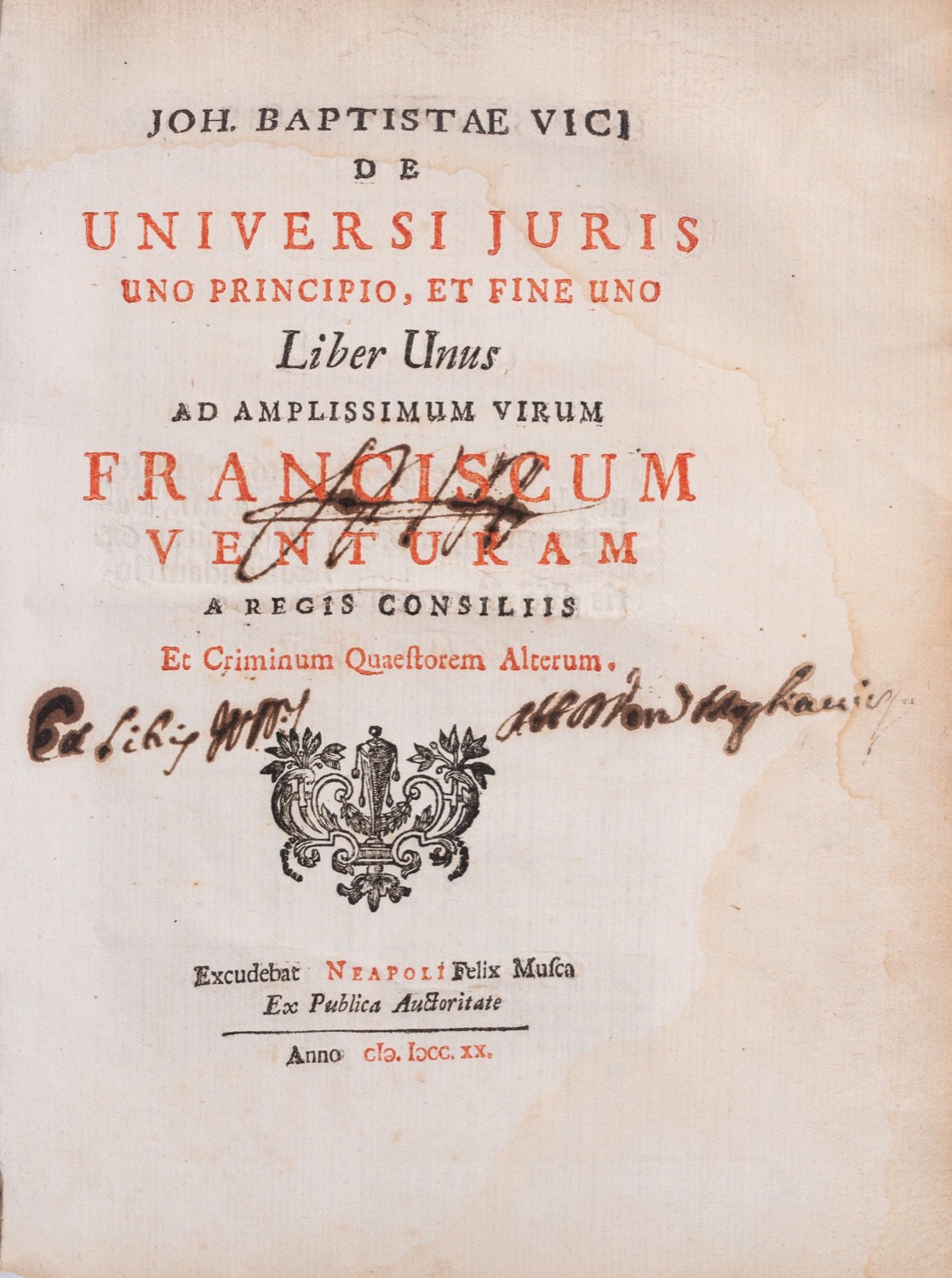Liber Unus. Ad amplissimum virum Franciscum Venturam. Prima Edizione. Neapoli-excudebat Felix Mosca, 1720 in 8° (mm. 185x245) pp. (6), 195, (2) [segn. A2-Z2, Aa2-Bb] con capolettera e finalino. Frontespizio con titoli in rosso e nero con marca tipografica. Appunti manoscritti d'epoca alla carta bianca. Ex libris manoscritto al frontespizio. Esemplare a pieni margini con alcune forti bruniture, ampie gore e carta ondulata. Legatura coeva in piena pelle morbida con titoli manoscritti al dorso. Opera fondamentale riguardante la trattazione vichiana sul Diritto universale in cui ristabilisce il primato della verità filosofica, prima che cattolica, del Diritto naturale. In essa imposta il rapporto tra il diritto naturale e quello positivo quale rapporto tra il vero e il certo; inoltre il Vico sottolinea la differenza tra la "voluntas regis" e la "ratio legis" ossia tra il volere del legislatore attinente alle utilità e la conformità della legge alla natura della cosa attinente all'onestà, quest'ultima immutabile e "cosa eterna".Liber Unus. Ad amplissimum virum Franciscum Venturam. Prima Edizione. Neapoli-excudebat Felix Mosca, 1720 in 8° (mm. 185x245) pp. (6), 195, (2) [segn. A2-Z2, Aa2-Bb] con capolettera e finalino. Frontespizio con titoli in rosso e nero con marca tipografica. Appunti manoscritti d'epoca alla carta bianca. Ex libris manoscritto al frontespizio. Esemplare a pieni margini con alcune forti bruniture, ampie gore e carta ondulata. Legatura coeva in piena pelle morbida con titoli manoscritti al dorso. Opera fondamentale riguardante la trattazione vichiana sul Diritto universale in cui ristabilisce il primato della verità filosofica, prima che cattolica, del Diritto naturale. In essa imposta il rapporto tra il diritto naturale e quello positivo quale rapporto tra il vero e il certo; inoltre il Vico sottolinea la differenza tra la "voluntas regis" e la "ratio legis" ossia tra il volere del legislatore attinente alle utilità e la conformità della legge alla natura della cosa attinente all'onestà, quest'ultima immutabile e "cosa eterna".