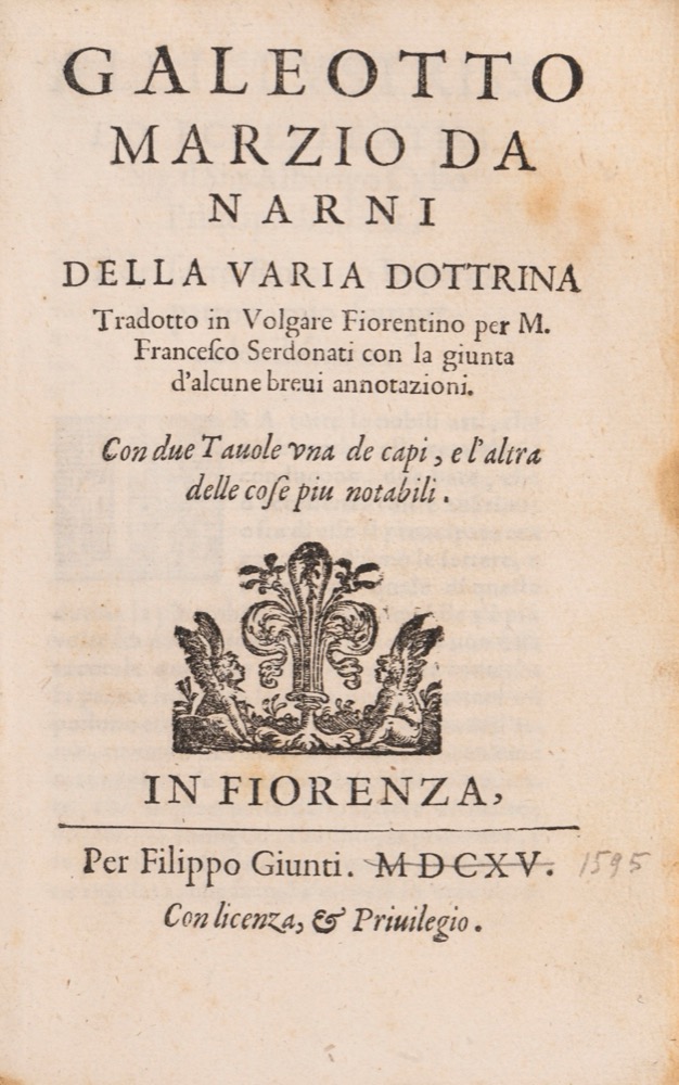 Galeotto Marzio - Della varia dottrina tradotto in volgare fiorentino per m. Francesco Serdonati con la giunta d'alcune brevi annotazioni, 1595