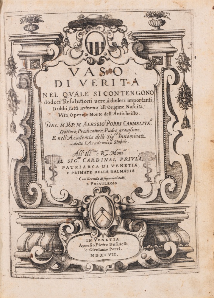 Alessio Porro - Vaso di verità nel quale si contengono dodeci resolutioni vere, a dodeci importanti, dubbi, fatti intorno all'origine, nascita, vita, opere, e morte dell'Antichristo. Del m.r.p.m. Alessio Porri carmelita.o, dottore, predicatore, padre gravissimo, e nell'Academia delli sig.ri Innominati detto l'Academico Stabile. All'ill.mo e r.mo mons.or il sig.or cardinal Priuli, patriarca di Venetia, e primate della Dalmatia, 1597