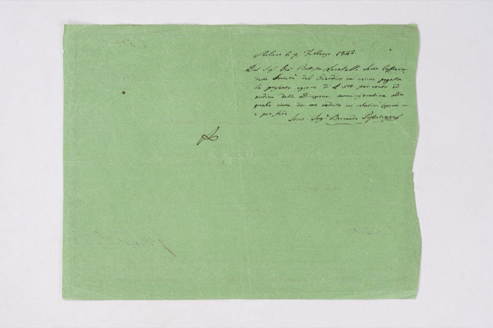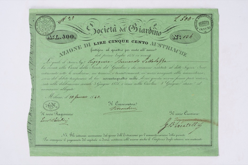 Storico titolo azione di Lire 500 fruttante al 4% l'anno della Società del Giardino, raffinato club per gentiluomini di Milano ancora esistente. Su carta verde, 210 x 260 mm., l'azione è intestata all'Ingegnere Bernardo Pestalozza.Storico titolo azione di Lire 500 fruttante al 4% l'anno della Società del Giardino, raffinato club per gentiluomini di Milano ancora esistente. Su carta verde, 210 x 260 mm., l'azione è intestata all'Ingegnere Bernardo Pestalozza.