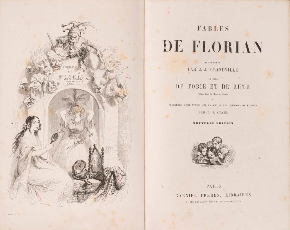 Parigi, Garnier Frères Libraires, s.d. (circa 1860). In 8°. Legatura in mezza pelle. Dorso con 4 nervi e con titolo e fregi in oro. Tagli dorati. Edizione illustrata da J.J. Grandville. Testo in francese. Leggere arrossature e piccolo strappo al frontespizio. Parigi, Garnier Frères Libraires, s.d. (circa 1860). In 8°. Legatura in mezza pelle. Dorso con 4 nervi e con titolo e fregi in oro. Tagli dorati. Edizione illustrata da J.J. Grandville. Testo in francese. Leggere arrossature e piccolo strappo al frontespizio.