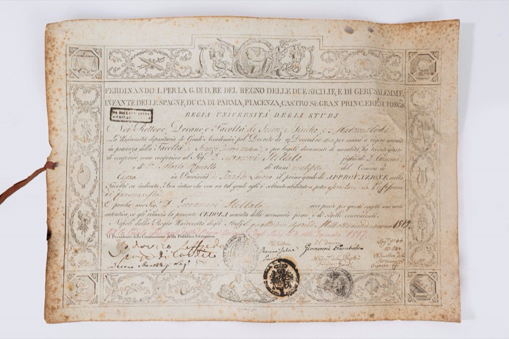 Pergamena di laurea della Regia Università degli Studi, facoltà di scienze fisiche e matematica, rilasciata per esercitare la professione di farmacista a Dott. Giovanni Stellato il 14 aprile 1819. La pergamena presenta la firma del Rettore e dei membri della commissione ed è corredata dei timbri dell'Università. Pergamena di laurea della Regia Università degli Studi, facoltà di scienze fisiche e matematica, rilasciata per esercitare la professione di farmacista a Dott. Giovanni Stellato il 14 aprile 1819. La pergamena presenta la firma del Rettore e dei membri della commissione ed è corredata dei timbri dell'Università.