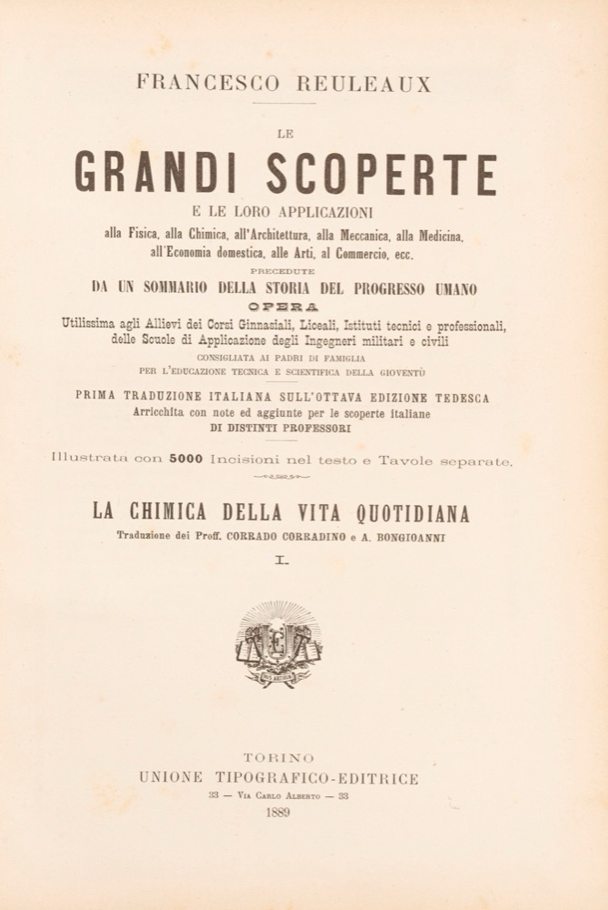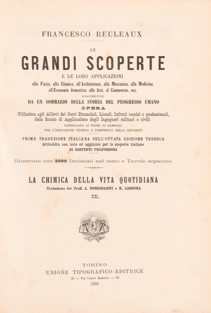 Francesco Reuleaux, Le Grandi Scoperte. La Chimica della Vita Quotidiana, Torino, Unione Tipografico-Editrice, 1889-1891. In 8°. Opera in 2 volumi. Legatura in piena tela riccamente decorata in oro al piatto anteriore e al dorso. Antiporta illustrato al verso. Edizione illustrata sia nel testo sia con tavole separate. Dedica autografa in inchiostro bruno.