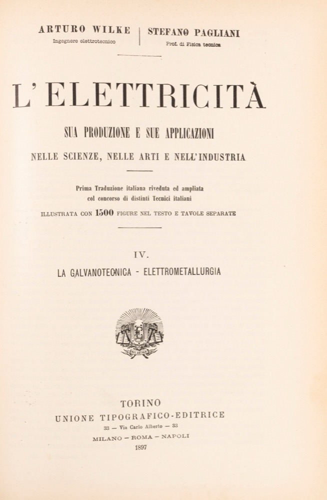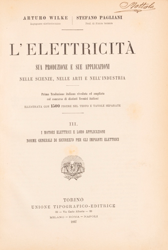 Arturo Wilke e Stefano Pagliani, Le Grandi Scoperte. L'Elettricità sua produzione e sue applicazioni, Torino, Unione Tipografico Editore, 1897. In 8°. Legatura in piena tela riccamente decorata in oro al piatto anteriore e al dorso. Firma d'appartenenza in inchiostro bruno. Terzo volume. Edizione illustrata sia nel testo che fuori con tavole separate.
