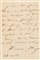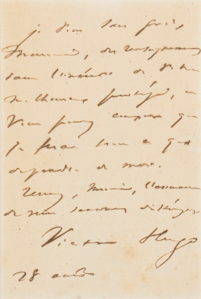 Lettera autografa, firmata e datata da Victor Hugo, 120x180 mm. Reca un testo che cita: "Ho fatto bene, Signore, a usare senza autorizzazione, come un uomo di fretta, questo mezzo per inviare il mio scritto bene alla sua destinazione, da mano a mano. Grazie (cosa rara) per essermene riconoscente. Victor Hugo, 28 agosto."