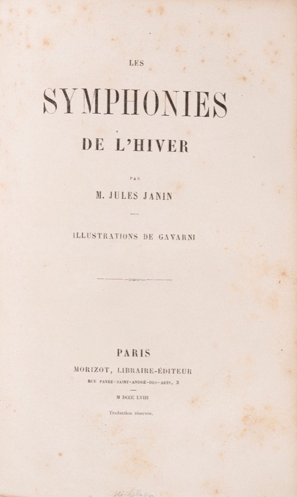 Parigi, Morizot Libraire-Éditeur, 1858. In 8°. Legatura editoriale in tela con decorazioni a colori e in oro. Illustrazioni sui piatti e sul dorso. Tagli dorati. Prima edizione. Illustrazioni a cura di Gavarni, incise da Colin, Willmann, Rouargue, Calamatta. Testo in francese. Leggere arrossature e lieve difetto al dorso. Parigi, Morizot Libraire-Éditeur, 1858. In 8°. Legatura editoriale in tela con decorazioni a colori e in oro. Illustrazioni sui piatti e sul dorso. Tagli dorati. Prima edizione. Illustrazioni a cura di Gavarni, incise da Colin, Willmann, Rouargue, Calamatta. Testo in francese. Leggere arrossature e lieve difetto al dorso.