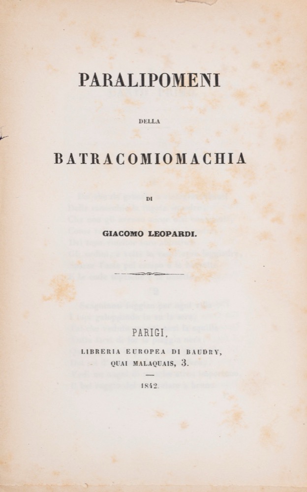 Avviso al piatto posteriore che recita: “Alle Opere di Giacomo Leopardi stampate in Firenze nell'anno 1845 in tre volume pei tipi di Felice Le Monnier è necessario complemento questo Poemetto in otto canti intitolato Paralipomeni della Batracomiomachia. Prezzo: Franchi 3”. Fioriture sparse, peraltro buon esemplare intonso con barbe.