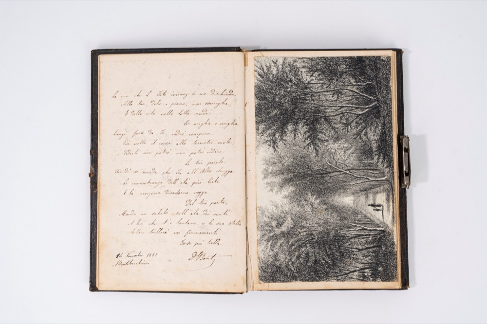 In 8° piccolo. Liber amicorum, manoscritti e firmati da diversi personaggi, dedicati a Beatrice (Bice) Banti di Montebicchieri, comune in provincia di Pisa. Penultima decade dell'Ottocento. Qualche illustrazione completa il libro. Legatura rigida in marocchino nero con fermaglio a chiusura e stemma in metallo impresso al piatto anteriore. Tagli in oro. Lievi difetti al dorso del volume.