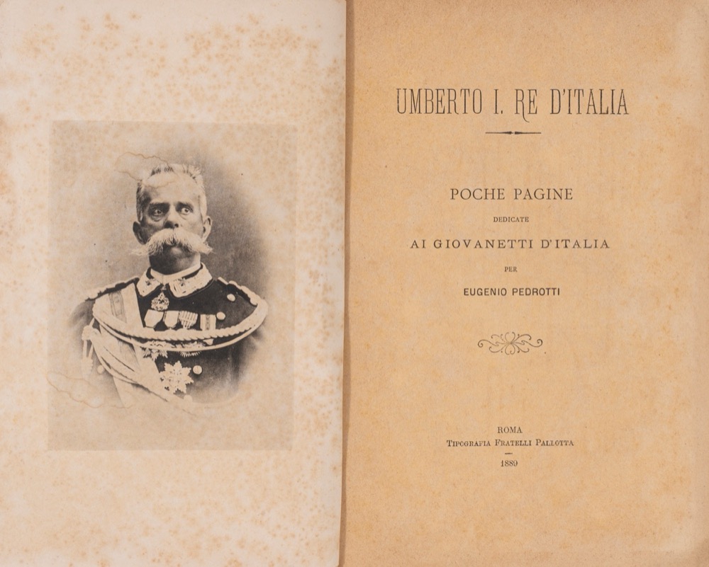Umberto I di Savoia (Torino 1844 - Monza 1900), figlio di Vittorio Emanuele II e di Maria Adelaide. Salì al trono nel 1878. In politica estera guardò con favore alla Triplice Alleanza (1882) e appoggiò la politica crispina di espansione coloniale. Sul piano interno sostenne la svolta autoritaria di fine secolo, e in conseguenza di tale atteggiamento fu ucciso a Monza dall'anarchico G. Bresci.Roma, Tipografia Fratelli Pallotta, 1889. In 8°. Ritratto raffigurante Re Umberto I aggiunto in un foglio separato prima del frontespizio. Esemplare in brossura. Leggere bruniture e lievi segni del tempo.