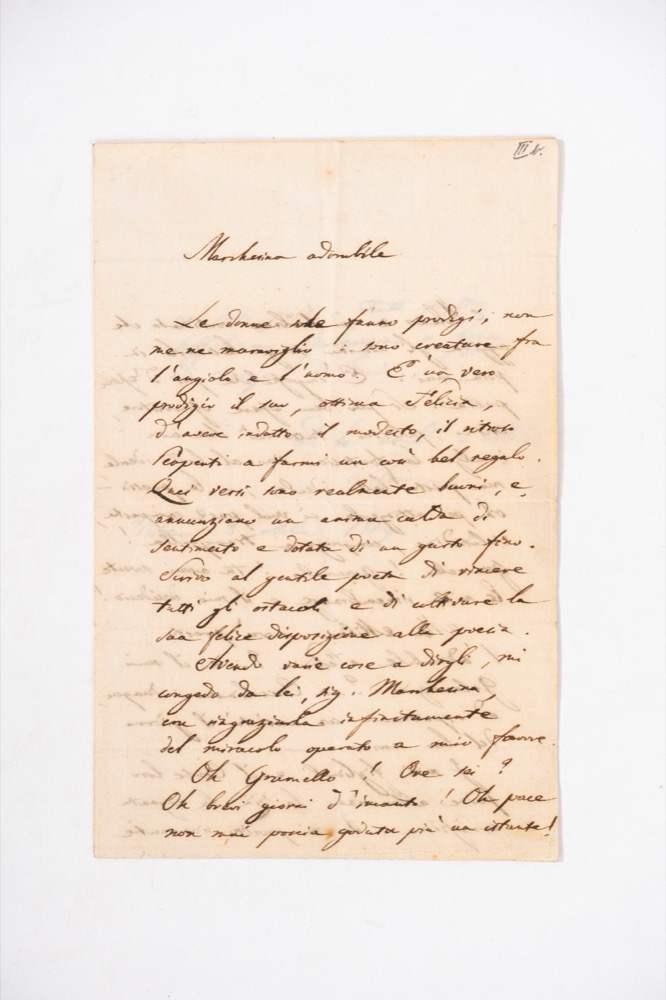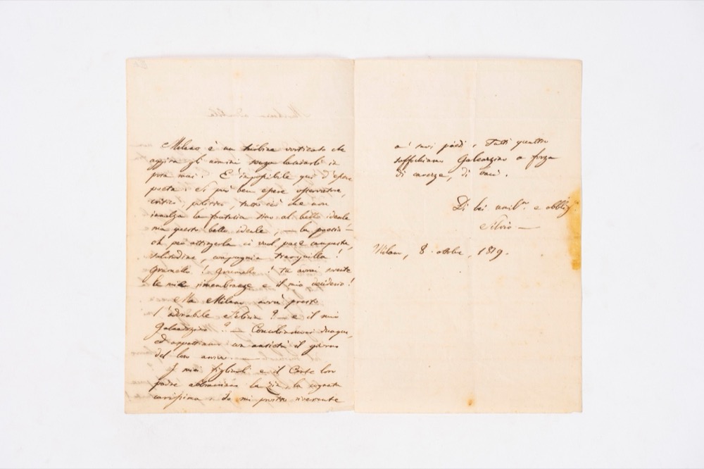 Lettera autografa indirizzata alla marchesa Felicia Giovio Porro (1781-1849). Milano, 8 ottobre 1819. Bifolio, mm. 188x122, vergato su tre della quattro facciate e firmato “Silvio”. Tracce di piegatura, macchia al margine esterno della seconda carta, qualche fioritura, ma ben conservata.Lettera autografa indirizzata alla marchesa Felicia Giovio Porro (1781-1849). Milano, 8 ottobre 1819. Bifolio, mm. 188x122, vergato su tre della quattro facciate e firmato “Silvio”. Tracce di piegatura, macchia al margine esterno della seconda carta, qualche fioritura, ma ben conservata.