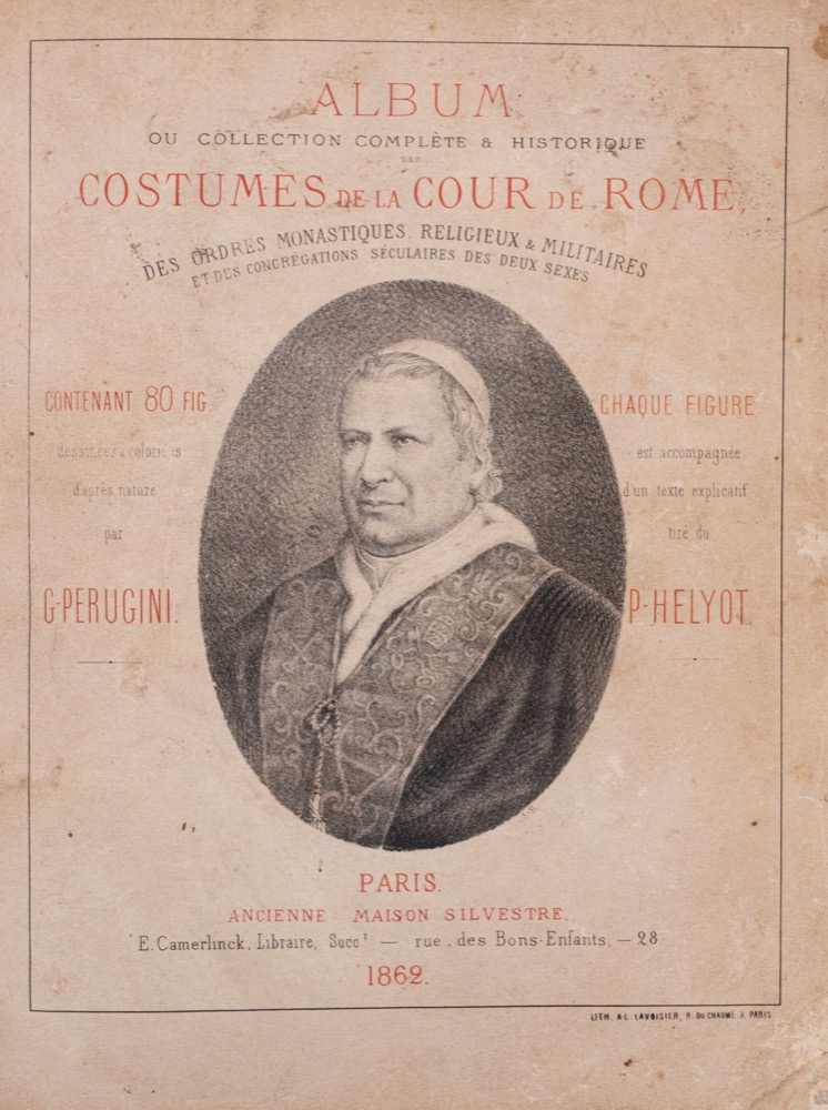 Seconda edizione, esemplata sulla prima, apparsa nel 1852, di questa splendida suite di "planches...copiées sur les recueils de costumes ecclesiastiques de Ferrari et Capparoni", Colas I 2323; Hiler 702; Lipperheide 1825.