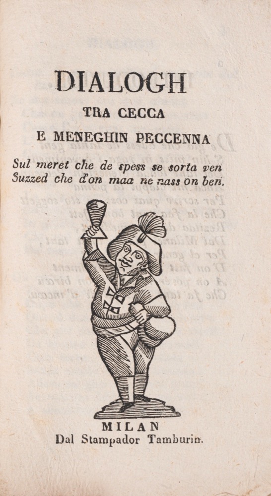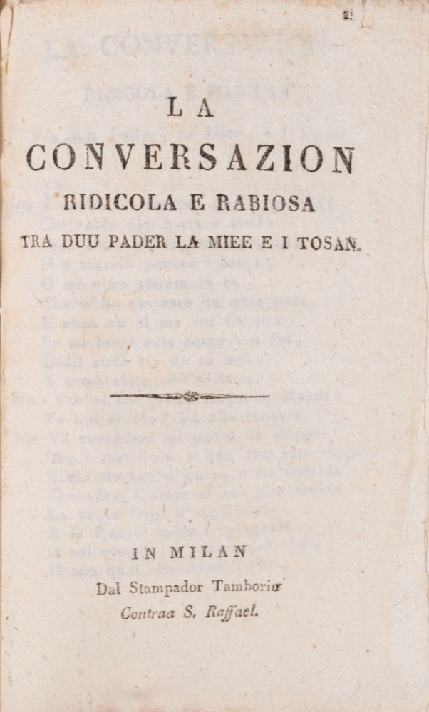 Milano, Stampador Tamburin, s.d. (prima metà dell'800). Raccolta di poesie in dialetto milanese. Lotto di 6 volumi in brossura contenuti all'interno di una cartellina in cartonato. Vignette al frontespizio e al fine.