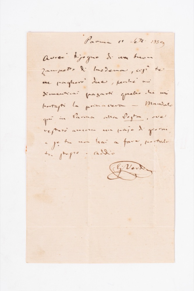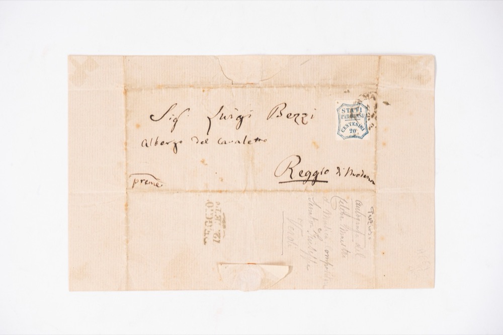 Lettera autografa e firmata di Giuseppe Verdi, 135 x 210 mm. datata Parma 11 settembre 1859 e indirizzata al Signor Luigi Bezzi, Albergo del Canaletto, Parma. Scritto solo sul primo foglio recto. Il secondo foglio verso contiene il nome e l'indirizzo del destinatario, il francobollo e il sigillo in ceralacca. Il raro francobollo è il 20 centesimi azzurro non dentellato del Governo Provvisorio di Parma emesso nel 1859. Quando Maria Luisa di Borbone fuggì da Parma, capitale del ducato di Parma e Piacenza, nel 1859, fu sostituita da un governatore nominato da Vittorio Emanuele di Savoia, re di Sardegna, che dal 1° agosto introdusse i francobolli sardi al posto di quelli parmensi. Ciò sembrava preludere a un'imminente annessione di Parma alla Sardegna, ma Napoleone III la impedì. I francobolli sardi non poterono quindi più essere utilizzati e il governo decise di adottare un'emissione provvisoria che riportava, all'interno di un ottagono curvo, la semplice dicitura “Stati di Parma” insieme al valore. Tracce di piegatura, alcuni piccoli strappi marginali, ma ben conservato.