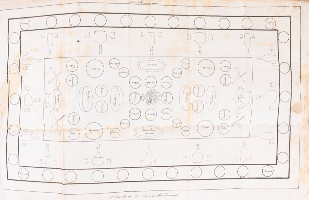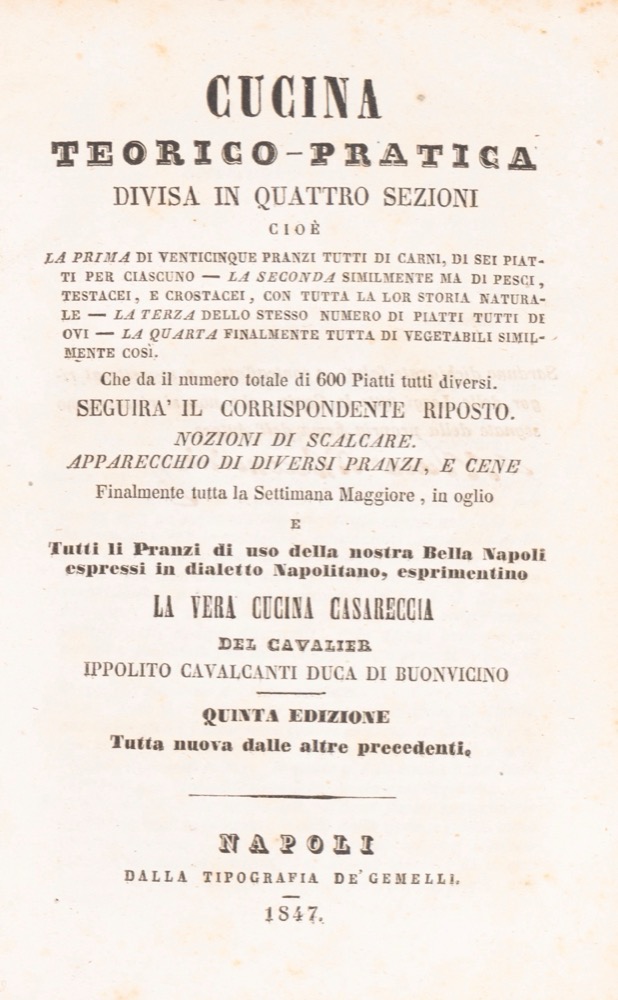 Divisa in quattro sezioni cioè la prima di Venticinque pranzi tutti di carni, di sei piatti per ciascuno. La seconda similmente ma di pesci, testacei e crostacei con tutta la storia naturale. La terza dello stesso numero di piatti tutti di ovi. La quarta finalmente tutta di vegetali similmente così. Che dà il totale di 600 piatti tutti diversi. Seguirà il corrispondente riposto. Nozioni di scalcare. Apparecchio di diversi pranzi e cene. Finalmente tutta la Settimana Maggiore in oglio e tutti li Pranzi di uso della nostra Bella Napoli e pressi in dialetto Napolitano, esprimentino "La vera cucina casareccia". Quinta edizione tutta nuova dalle altre precedenti. Napoli, dalla Tipografia De' Gemelli, 1847. 8°, con tre tavole incise su rame, più volte ripiegate, raffigurante modi diversi di imbandire la tavola. Legatura coeva mz. pelle, titolo e fregi in oro al dorso. Divisa in quattro sezioni cioè la prima di Venticinque pranzi tutti di carni, di sei piatti per ciascuno. La seconda similmente ma di pesci, testacei e crostacei con tutta la storia naturale. La terza dello stesso numero di piatti tutti di ovi. La quarta finalmente tutta di vegetali similmente così. Che dà il totale di 600 piatti tutti diversi. Seguirà il corrispondente riposto. Nozioni di scalcare. Apparecchio di diversi pranzi e cene. Finalmente tutta la Settimana Maggiore in oglio e tutti li Pranzi di uso della nostra Bella Napoli e pressi in dialetto Napolitano, esprimentino "La vera cucina casareccia". Quinta edizione tutta nuova dalle altre precedenti. Napoli, dalla Tipografia De' Gemelli, 1847. 8°, con tre tavole incise su rame, più volte ripiegate, raffigurante modi diversi di imbandire la tavola. Legatura coeva mz. pelle, titolo e fregi in oro al dorso.