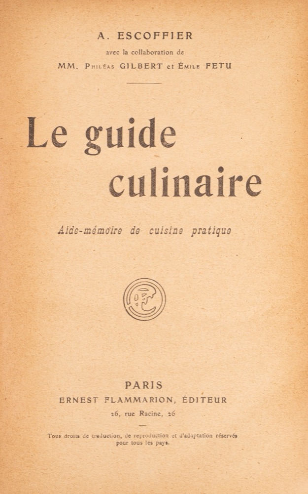 Escoffier (1846-1935) fu definito “il re dei cuochi e il cuoco dei re”, ha il merito di aver semplificato la grande sapienza cucinaria di Carême, di aver ridotto all’essenziale la complessa struttura della haute cuisine ottocentesca, di aver acconsentito al nascere di una gourmandise e di aver saputo riorganizzare il menu e l’etichetta della cucina borghese moderna dopo una gestazione durata più di mezzo secolo. In questo senso, Le livre des menus, che Escoffier pubblicò nel 1912, si può considerare la base del pranzo moderno, almeno fino alla grande rivoluzione della nouvelle cuisine. Le guide culinaire. Aide-mémoire de cuisine pratique. e Le livre des menus. Complément indispensable du Guide Culinaire. Avec la collaboration de M.N. Philéas Gilbert et Emile Fetu. Paris, Flammarion (al colophon E. Grevin Imprimerie de Lagny), 1926 e 1924.