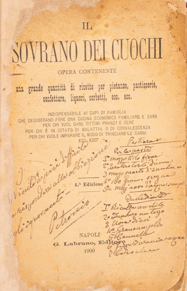 Opera contenente un grande quantità di ricette per pietanze, pasticcerie, confetture, liquori, sorbetti, ecc. ecc. Napoli, Lubrano, 1900. 8°. Restauro ai margini bianchi di alcune pagine. Legatura moderna mz. tela con angoli, tassello, titolo in oro al dorso. Opera contenente un grande quantità di ricette per pietanze, pasticcerie, confetture, liquori, sorbetti, ecc. ecc. Napoli, Lubrano, 1900. 8°. Restauro ai margini bianchi di alcune pagine. Legatura moderna mz. tela con angoli, tassello, titolo in oro al dorso.