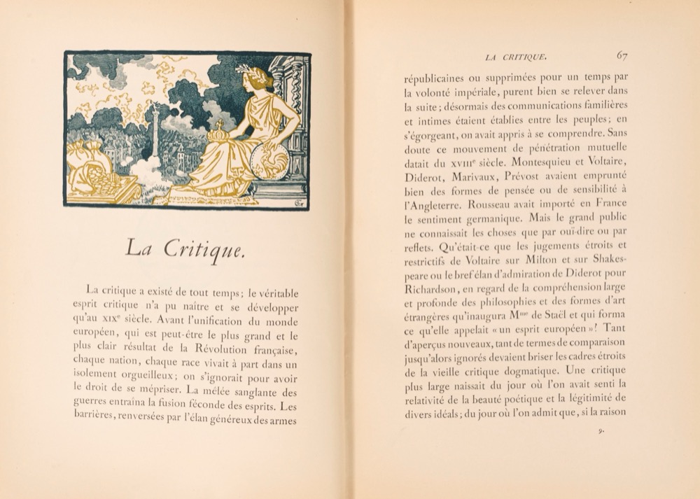 Parigi, Édouard Pelletan, 1903. In 8°. Rilegatura in mezza pelle con angoli. Dorso con 5 nervi e con titolo e anno in oro. Copertina della brossura editoriale conservata. Frontespizio in rosso e nero con piccola illustrazione. Testo in francese. Esemplare n. XIII di una tiratura limitata di 900 volumi. Firma dell'editore con dedica autografa. Il libro è corredato da numerose composizioni a colori ad opere di Eugène Grasset, incise da Émile Froment. Bel esemplare, in ottimo stato di conservazione. Parigi, Édouard Pelletan, 1903. In 8°. Rilegatura in mezza pelle con angoli. Dorso con 5 nervi e con titolo e anno in oro. Copertina della brossura editoriale conservata. Frontespizio in rosso e nero con piccola illustrazione. Testo in francese. Esemplare n. XIII di una tiratura limitata di 900 volumi. Firma dell'editore con dedica autografa. Il libro è corredato da numerose composizioni a colori ad opere di Eugène Grasset, incise da Émile Froment. Bel esemplare, in ottimo stato di conservazione.