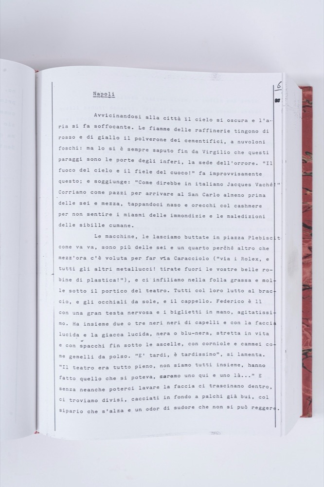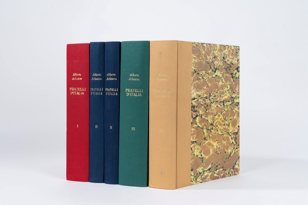 Fotocopie del dattiloscritto (si vedono ai lati i bordi originari dei fogli) eseguito su macchina da scrivere elettrica (da qui varie tipologie di caratteri). 1993-2020, mm. 294x215; 4 v., v. 1: [3] - 451 c.; v. 2: 452-726; v. 3: 727-1282; v. 4: 1283-1770 c. Ciascun volume è rilegato con piatti in cartoncino rigido con decorazione in carta marmorizzata moderna, dorsi in tela color rosso, blu, grigio, verdolino recanti la scritta “Alberto Arbasino | Fratelli d’Italia”. Nella copia doppia del secondo volume troviamo interventi a penna e striscioline con testo dattiloscritto applicate alle seguenti carte: 455-461, 464, 466, 468, 472, 474, 475, 478, 481-485, 494, 497, 499, 511, 521, 523, 525, 527-528, 533, 536, 538, 543, 547, 548, 551, 556, 564, 570, 574, 577, 583, 586, 588, 589-598, 600-601, 603, 604, 605, 606, 609, 613, 621-622, 630, 644, 649-651, 657, 666, 669, 674, 692, 695, 700, 702, 703, 705, 711, 713, 715-719, 724.Fotocopie del dattiloscritto (si vedono ai lati i bordi originari dei fogli) eseguito su macchina da scrivere elettrica (da qui varie tipologie di caratteri). 1993-2020, mm. 294x215; 4 v., v. 1: [3] - 451 c.; v. 2: 452-726; v. 3: 727-1282; v. 4: 1283-1770 c. Ciascun volume è rilegato con piatti in cartoncino rigido con decorazione in carta marmorizzata moderna, dorsi in tela color rosso, blu, grigio, verdolino recanti la scritta “Alberto Arbasino | Fratelli d’Italia”. Nella copia doppia del secondo volume troviamo interventi a penna e striscioline con testo dattiloscritto applicate alle seguenti carte: 455-461, 464, 466, 468, 472, 474, 475, 478, 481-485, 494, 497, 499, 511, 521, 523, 525, 527-528, 533, 536, 538, 543, 547, 548, 551, 556, 564, 570, 574, 577, 583, 586, 588, 589-598, 600-601, 603, 604, 605, 606, 609, 613, 621-622, 630, 644, 649-651, 657, 666, 669, 674, 692, 695, 700, 702, 703, 705, 711, 713, 715-719, 724.