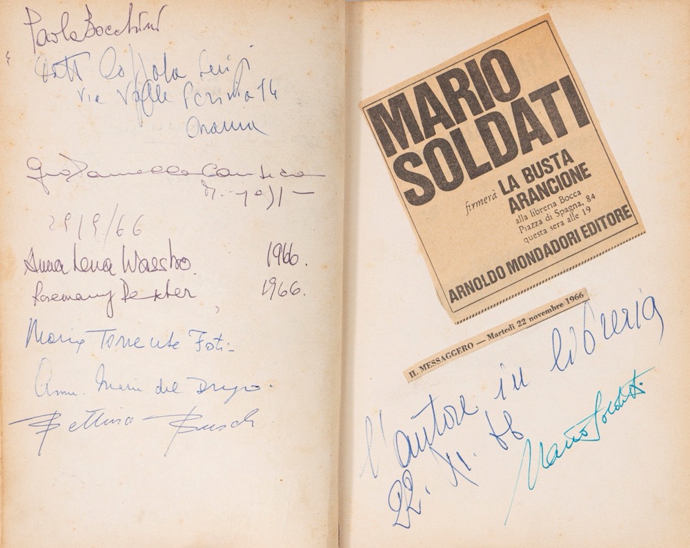 Interessante e corposo liber amicorum che va dagli inizi degli anni Sessanta sino al 1987 circa, proveniente dalla Libreria Bocca di piazza di Spagna (Roma), con un incredibile numero di scrittori, intellettuali e attori tra cui: Giovanni Macchia, Nelo Risi, Giorgio Albertazzi, Francesco Rosi, Arnoldo Foà, Elsa Morante, Nando Gazzolo, Giovanni Omiccioli, Sylva Koscina, Monica Vitti, Umberto Orsini, Alberto Moravia, Giorgio de Chirico, Pier Paolo Pasolini, Aroldo Tieri, Amedeo Nazzari, Bice Valori, Paolo Panelli, Gillo Pontecorvo, Dario Fo, Vittorio Gassman, Raf Vallone, Leonardo Sciascia, Natalia Ginzburg, Carlo Levi, Fabio Mauri, Salvator Gotta, Mario Soldati, Robert Kennedy, Sergio Tofano, Libero Bigiaretti, Cesare Zavattini, Neri Pozza, Lalla Romano, Don Lurio, Erich Segal con simpatico disegno, Giorgio Strehler, Enrico Montesano, Ornella Vanoni, Terence Hill, Caroline di Monaco, Paolo Volponi, Elio Pecora, Giorgio Bassani, Luigi Barzini, Paolo Villaggio, Dacia Maraini etc.Interessante e corposo liber amicorum che va dagli inizi degli anni Sessanta sino al 1987 circa, proveniente dalla Libreria Bocca di piazza di Spagna (Roma), con un incredibile numero di scrittori, intellettuali e attori tra cui: Giovanni Macchia, Nelo Risi, Giorgio Albertazzi, Francesco Rosi, Arnoldo Foà, Elsa Morante, Nando Gazzolo, Giovanni Omiccioli, Sylva Koscina, Monica Vitti, Umberto Orsini, Alberto Moravia, Giorgio de Chirico, Pier Paolo Pasolini, Aroldo Tieri, Amedeo Nazzari, Bice Valori, Paolo Panelli, Gillo Pontecorvo, Dario Fo, Vittorio Gassman, Raf Vallone, Leonardo Sciascia, Natalia Ginzburg, Carlo Levi, Fabio Mauri, Salvator Gotta, Mario Soldati, Robert Kennedy, Sergio Tofano, Libero Bigiaretti, Cesare Zavattini, Neri Pozza, Lalla Romano, Don Lurio, Erich Segal con simpatico disegno, Giorgio Strehler, Enrico Montesano, Ornella Vanoni, Terence Hill, Caroline di Monaco, Paolo Volponi, Elio Pecora, Giorgio Bassani, Luigi Barzini, Paolo Villaggio, Dacia Maraini etc.