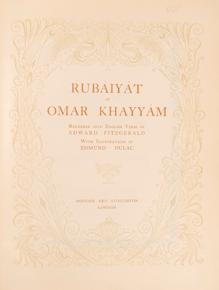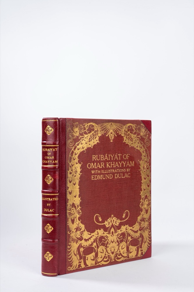 Londra, Hodder and Stoughton, 1919 circa. In 8°. Legatura in mezza pelle con piatti in tela (la legatura editoriale era in piena tela, rafforzo in pelle successivo). Dorso con 5 nervi e con titolo, illustratore e fregi in oro. Piatto anteriore riccamente decorato con disegno dorato raffigurante sembianze di pavone ed elefante. Traduzione in inglese a cura di Edward Fitzgerald. Edizione illustrata da Edmund Dulac. 20 splendide tavole a colori, applicate su cartoncino crema con bordo decorativo, ciascuna protetta da velina. Bel esemplare, ottimo stato di conservazione.Londra, Hodder and Stoughton, 1919 circa. In 8°. Legatura in mezza pelle con piatti in tela (la legatura editoriale era in piena tela, rafforzo in pelle successivo). Dorso con 5 nervi e con titolo, illustratore e fregi in oro. Piatto anteriore riccamente decorato con disegno dorato raffigurante sembianze di pavone ed elefante. Traduzione in inglese a cura di Edward Fitzgerald. Edizione illustrata da Edmund Dulac. 20 splendide tavole a colori, applicate su cartoncino crema con bordo decorativo, ciascuna protetta da velina. Bel esemplare, ottimo stato di conservazione.