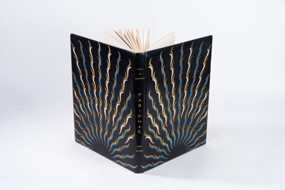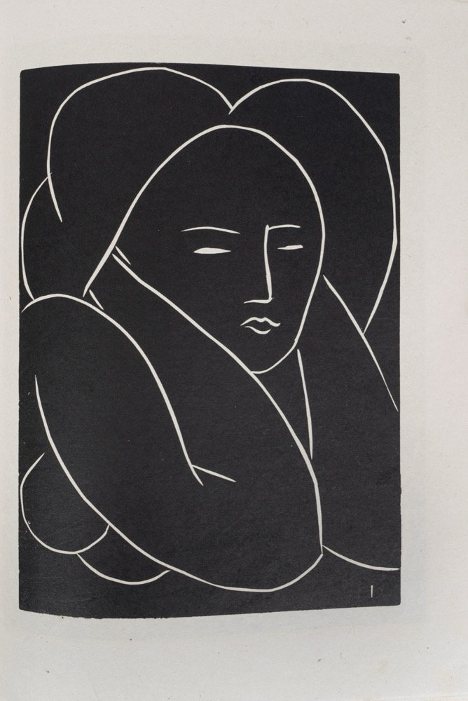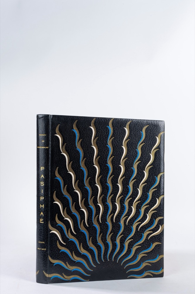 Perfetto esemplare di uno dei primi testi libri d'artista illustrati da Matisse, splendidamente riuscito nelle illustrazioni a piena pagina e particolarmente elegante nei fregi inseriti nel testo. Paris, Martin Fabiani, 1944. In 2°. 335 x 257 mm. Copertina editorale illustrata con delfini in bianco su fondo azzurro, SPLENDIDA LEGATURA FIRMATA DA THERESE MONCEY in marocchino blue foncé, titoli in oro al dorso, entrambi i piatti decorati da un'elaborata composizione di fiammelle o raggi solari, realizzati con volute in oro ed intarsio di pelle azzurra o bianca, camicia in mezzo marocchino blu e bande, astuccio. Edizione di 250 esemplari complessivi, questo è il n.17 dei 30 di testa su Japon ancien con l'aggiunta di una suite di 12 tavole impresse sur Chine. Illustrata da Matisse con una copertina in linogravure, 147 incisioni originali a sgorbio, di cuii 18 in b/n fuori testo, 39 testatine di cui 26 in nero e 13 in rosso, 6 culs-de-lampe e 84 iniziali in rosso.