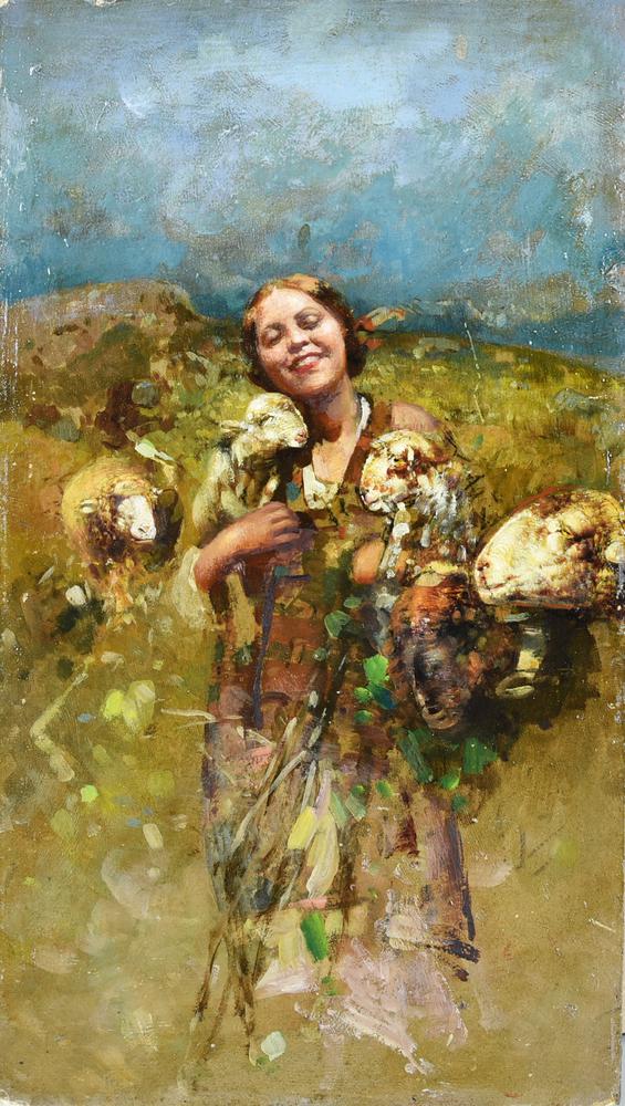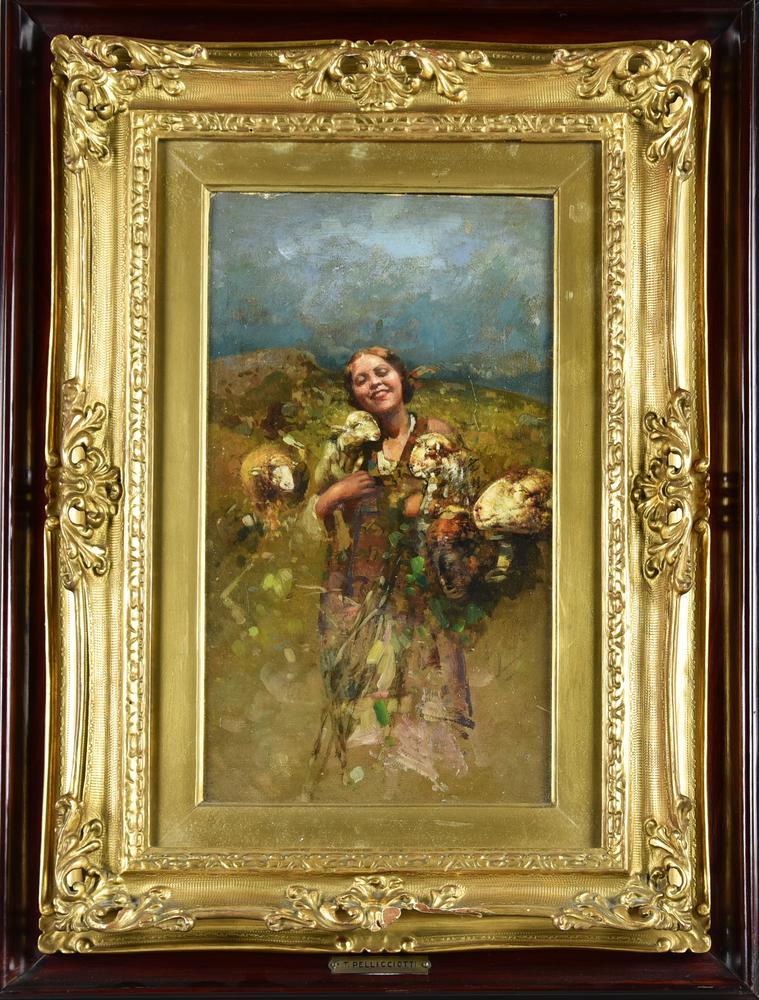 Tito Pellicciotti (attribuito a) CONTADINA CON AGNELLINI olio su cartoncino,...