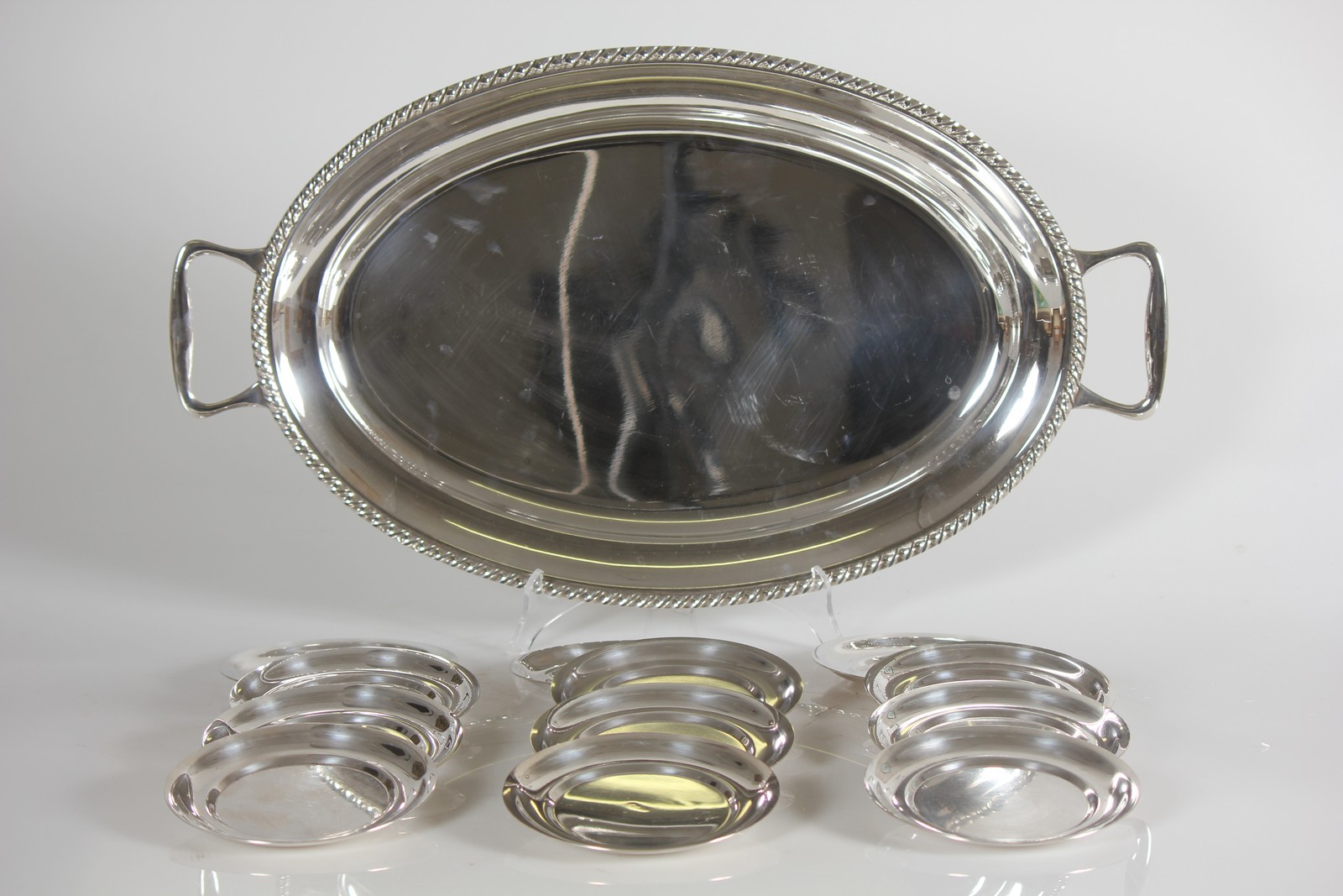 MANIFATTURA DEL XX SECOLO Vassoio in metallo argentato e 12 piattini per il pane. Metallo argentato. Cm 34,00 x 59,00 x 2,50.