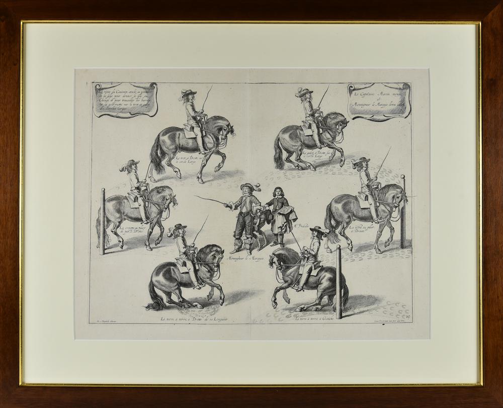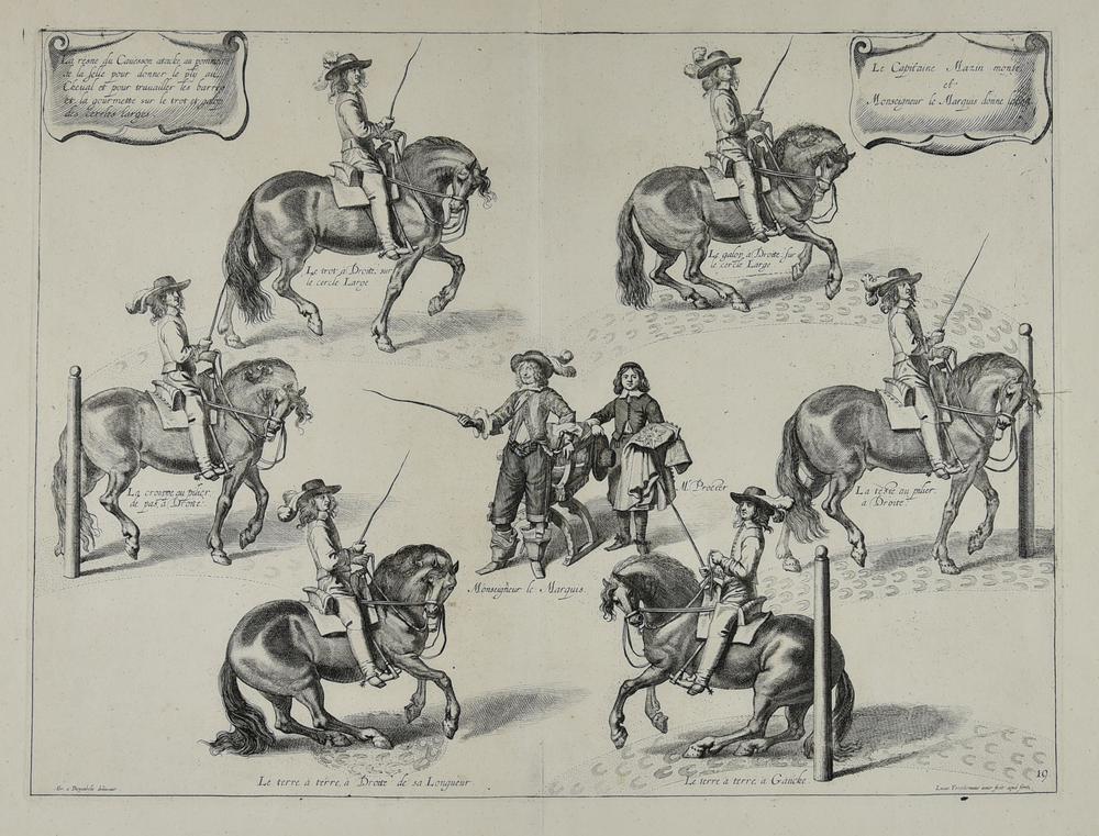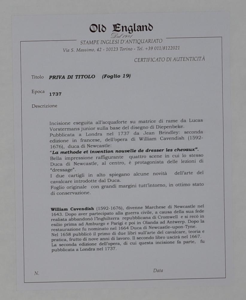 Opera realizzata da L. Vorstermans Jnr. (1595-1675), sulla base del disegno A. Diepenbeke (1596-1675), pubblicata a Londra da J. Breadley nella seconda edizione in francese dell'opera del Duca di Newcastle W. Cavendish (1592-1676): "La methode et invention nouvelle de dresser les chavaux". Nei cartigli sono riportate alcune novità nell'arte del dressage introdotte dal Duca.
