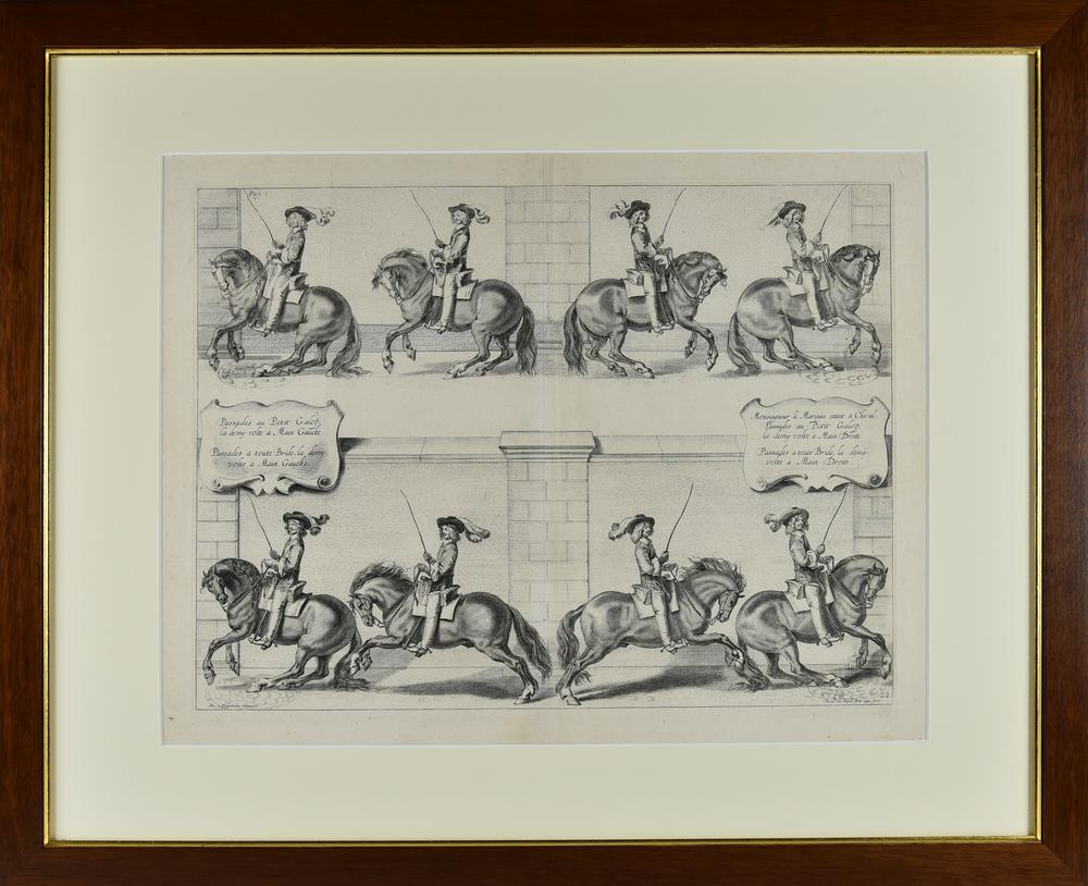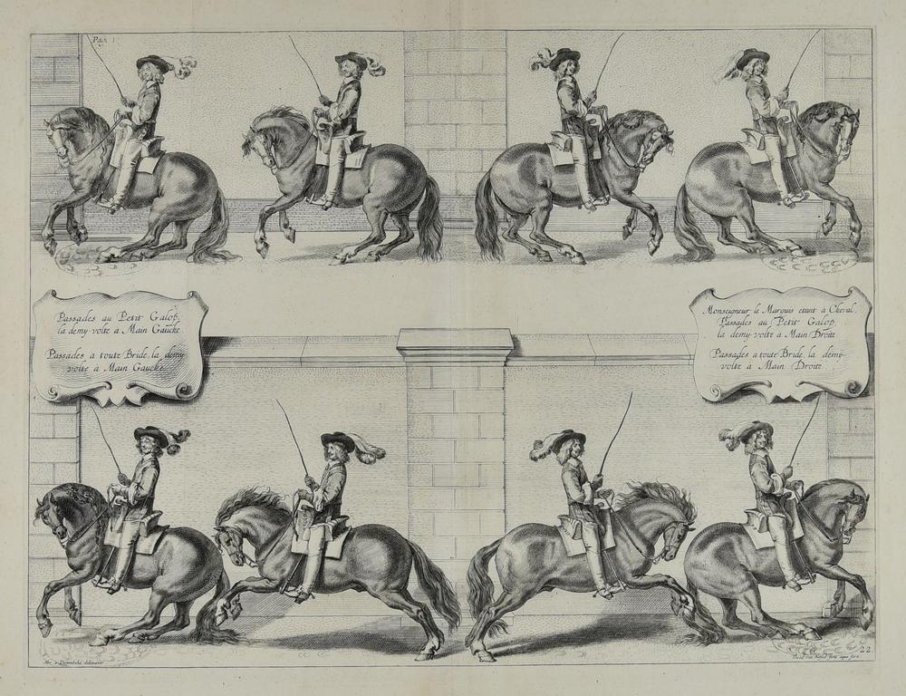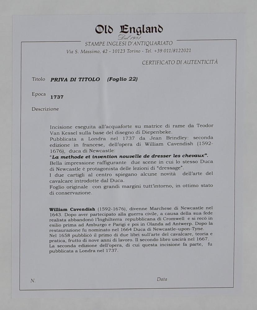 Opera realizzata da T. Van Kessel (1619-1696), sulla base del disegno A. Diepenbeke (1596-1675), pubblicata a Londra da J. Breadley nella seconda edizione in francese dell'opera del Duca di Newcastle W. Cavendish (1592-1676): "La methode et invention nouvelle de dresser les chavaux". Nei cartigli sono riportate alcune novità introdotte da Duca nell'arte del dressage.