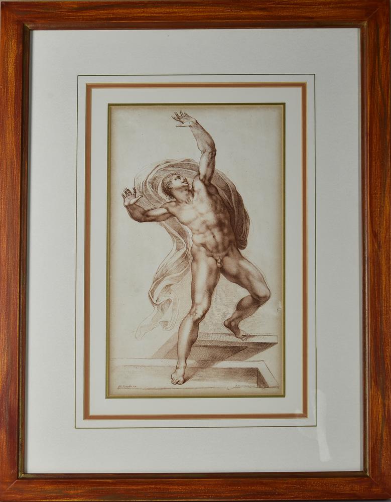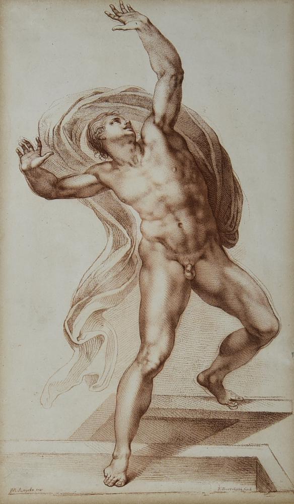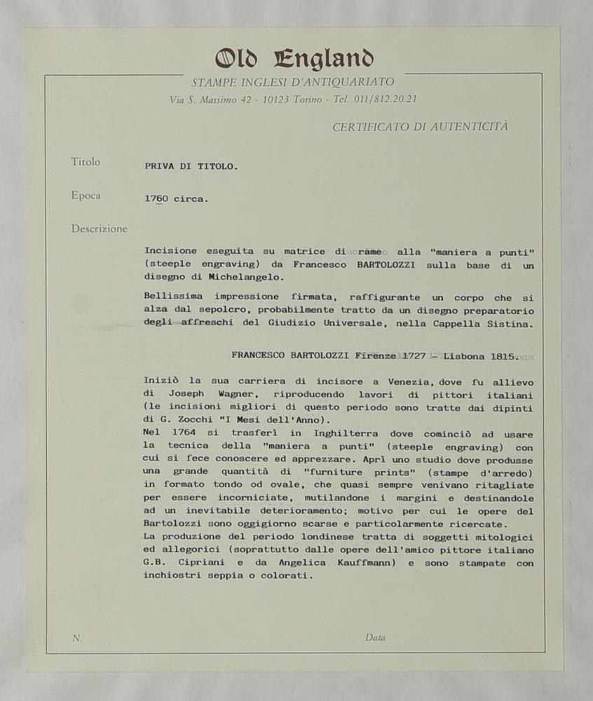 Opera realizzata F. Bartolozzi (1727-1815), sulla base di un disegno di M. Buonarroti; l'impressione riporta una figura che si erge da un sepolcro, probabilmente tratta da un disegno preparatorio del Giudizio Universale della Cappella Sistina.