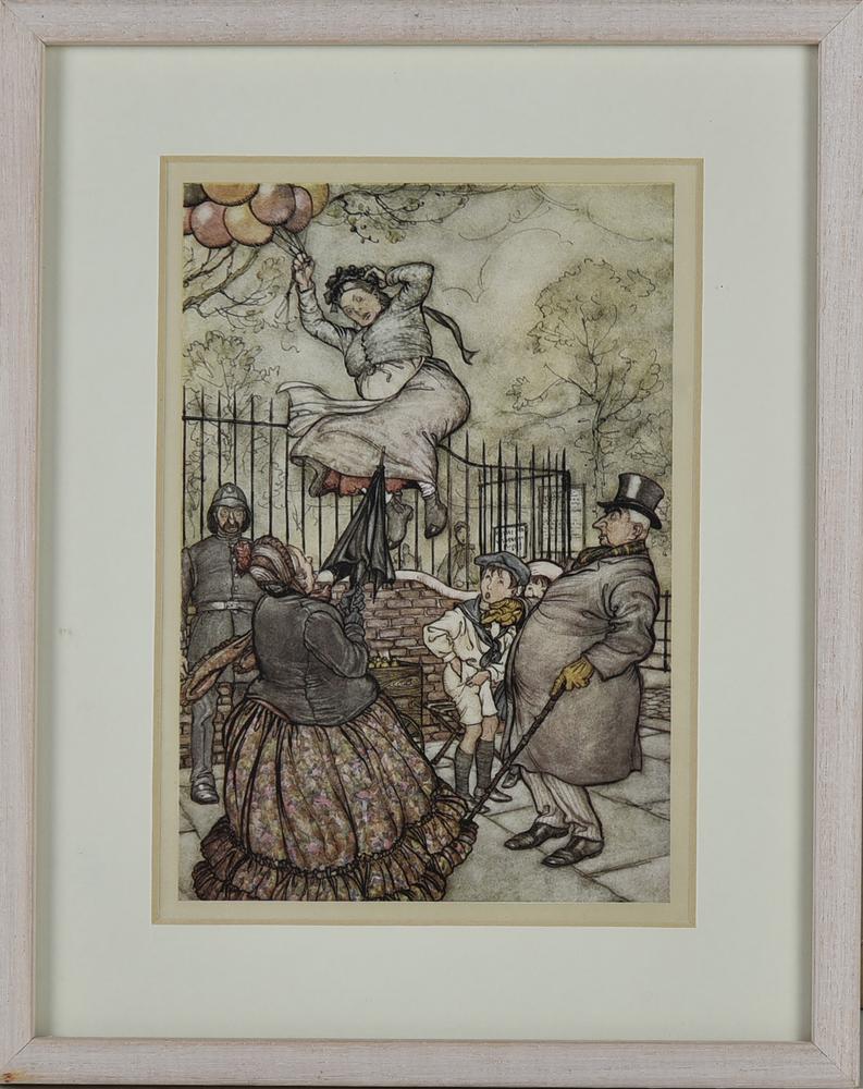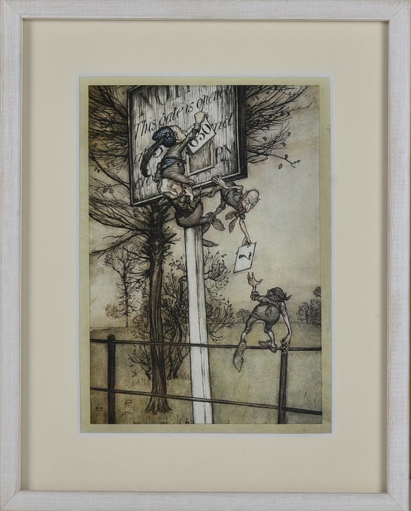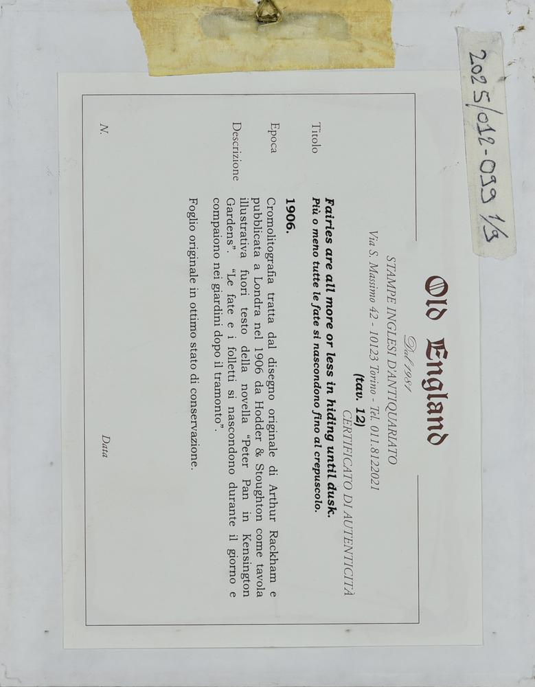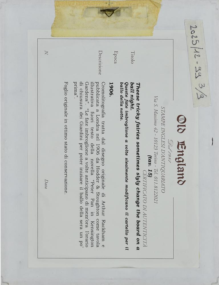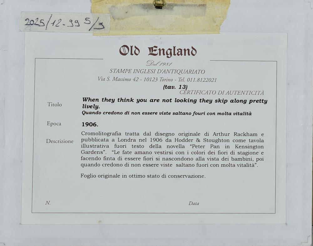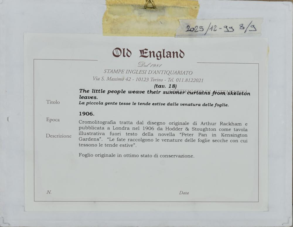 Tavole tratte dalla novella "Peter Pan in Kensington Gardens" di Sir J. M. Barrie (1860-1937), realizzate sulla base dei disegni originali di A. Rackam (1867-1939) e pubblicate a Londra da Hodder & Stoughton.