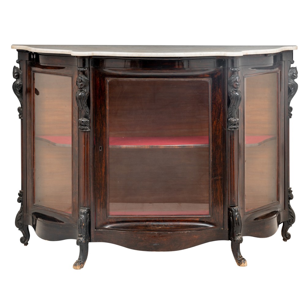 Etagere Luigi Filippo di forma centinata in legno esotico ad un'anta a vetro, piano in marmo bianco di Carrara.