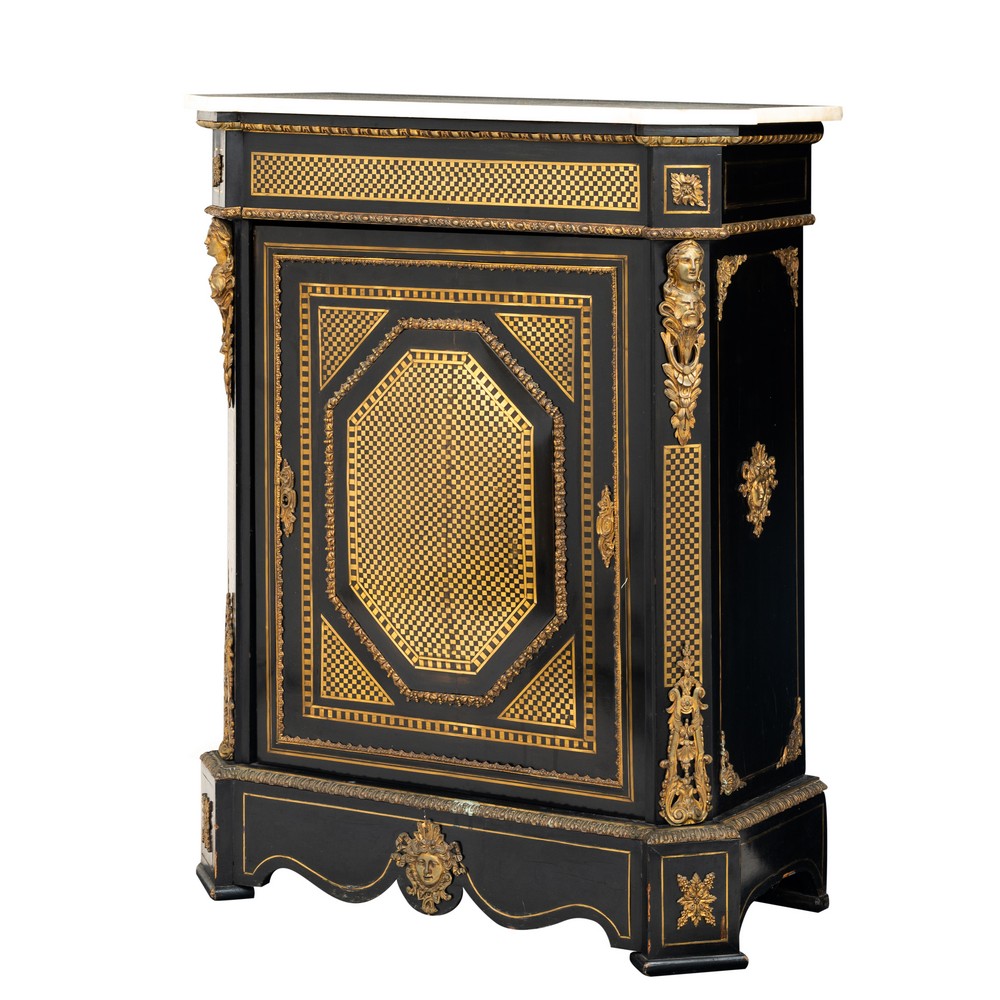 Credenza Napoleone III ad un'anta in legno ebanizzato, tarsie in rame e guarnita da bronzi dorati.
