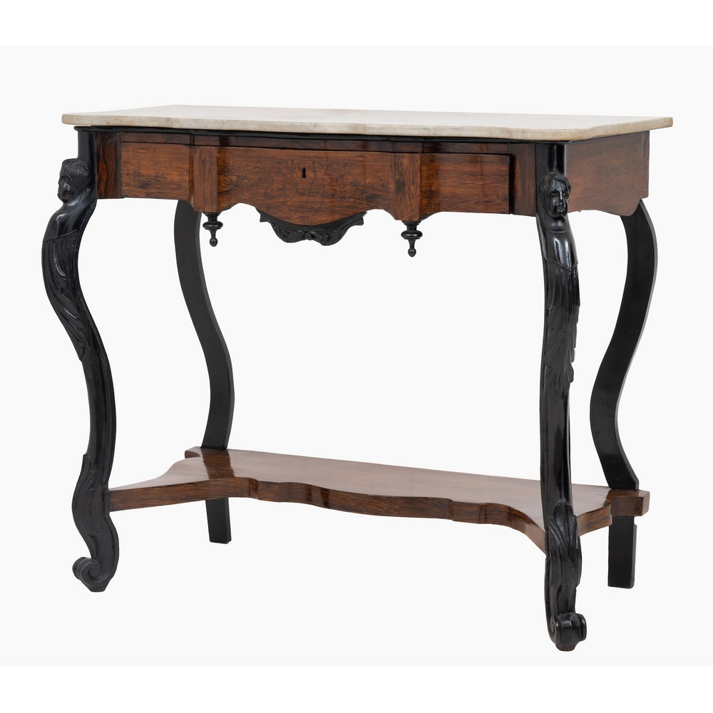 Consolle Luigi Filippo con cassetto centrale in legno esotico e legno ebanizzato, piano in marmo bianco.