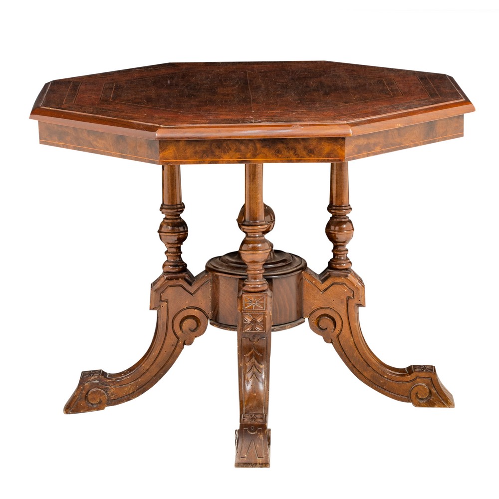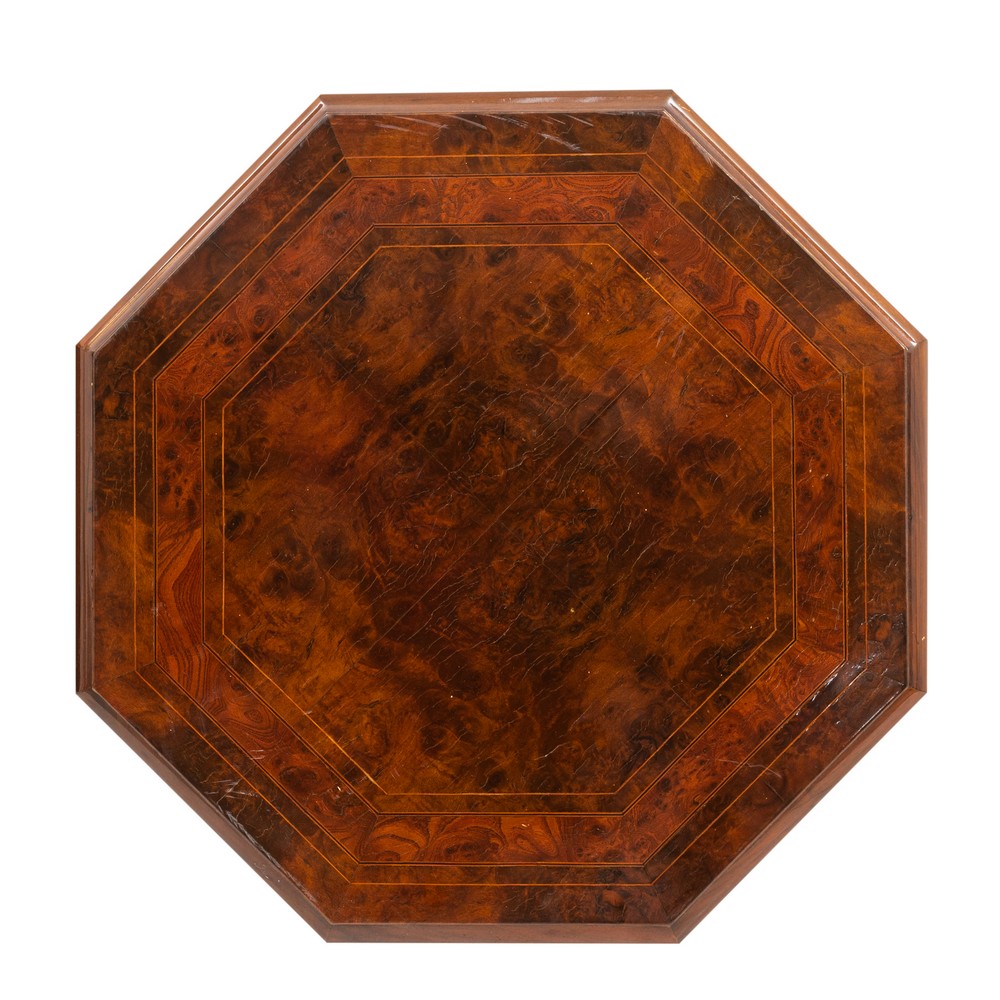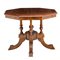 Tavolino ottagonale di gusto vittoriano in legno di noce con perfili in bosso.