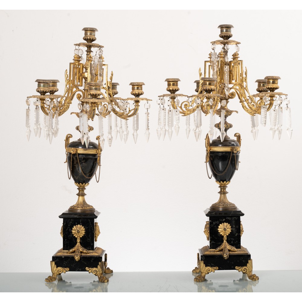 Coppia di candelabri a sei fiamme in bronzo dorato e marmo nero belga.