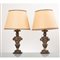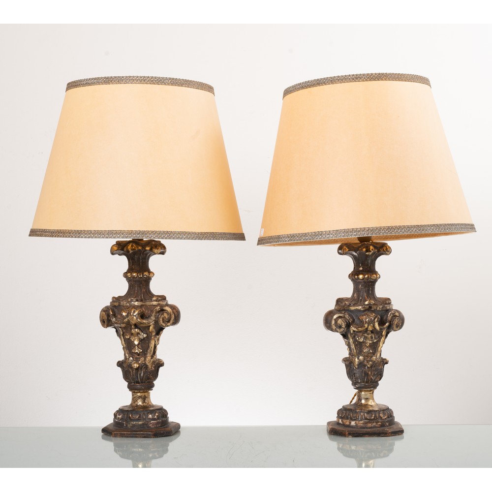 Coppia di pigne in legno intagliato e dorato ad argento a mecca trasformate a lumi.
