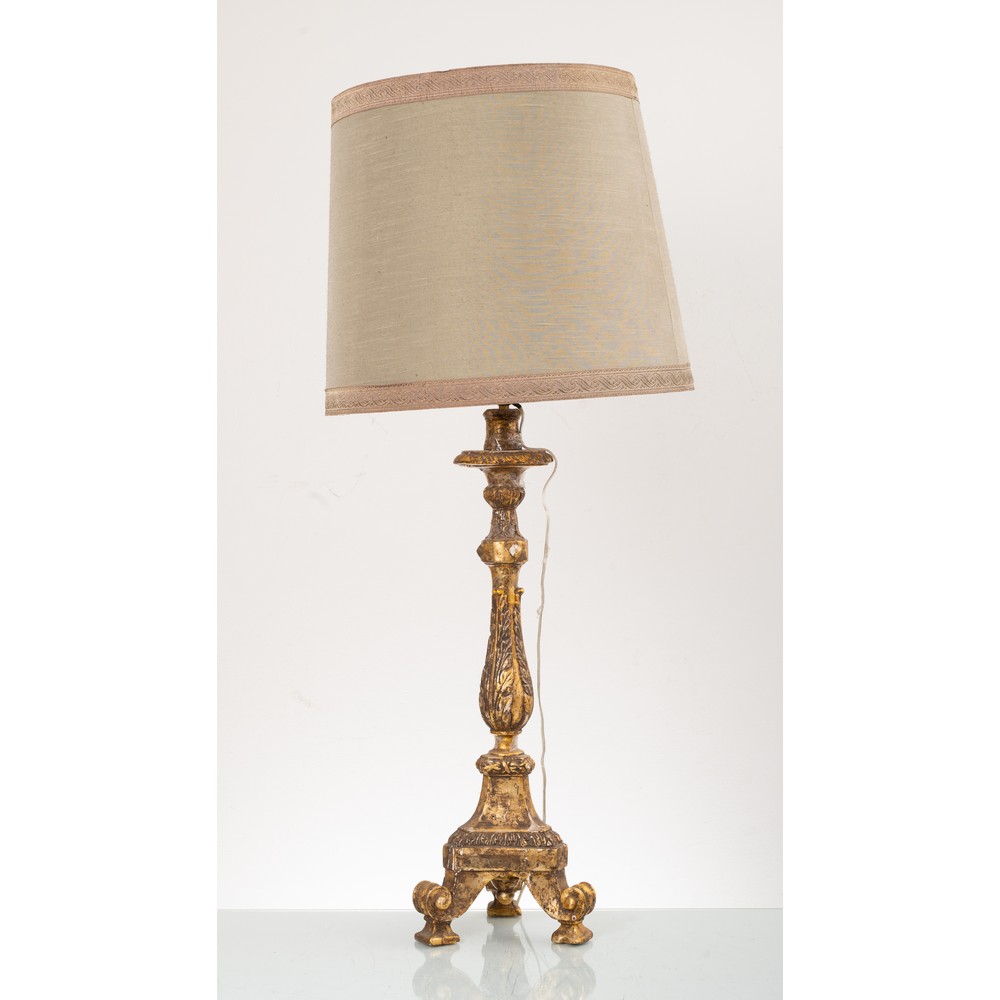 Torciere Luigi XVI in legno dorato ad argento a mecca con paralume (elettrificato).