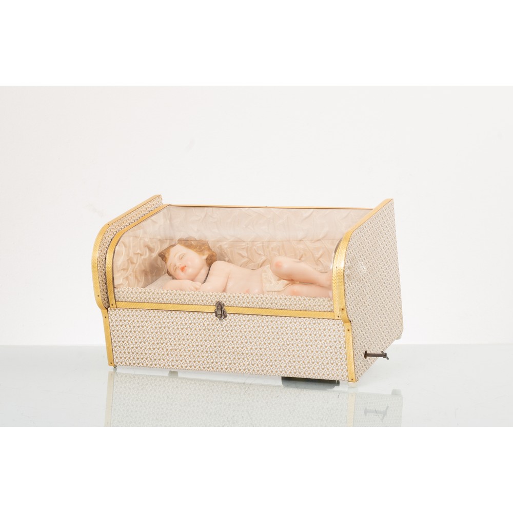 Scultura in cera raffigurante "Bambinello dormiente" con carillon.