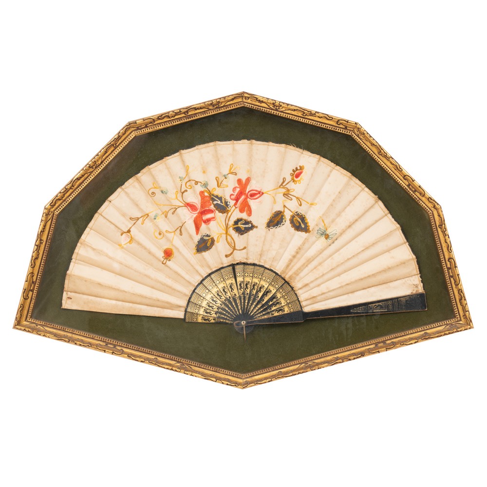 Ventaglio con pagina in seta ricamata a motivo floreale, stecche in legno ebanizzato e dorato entro ventagliera non coeva.