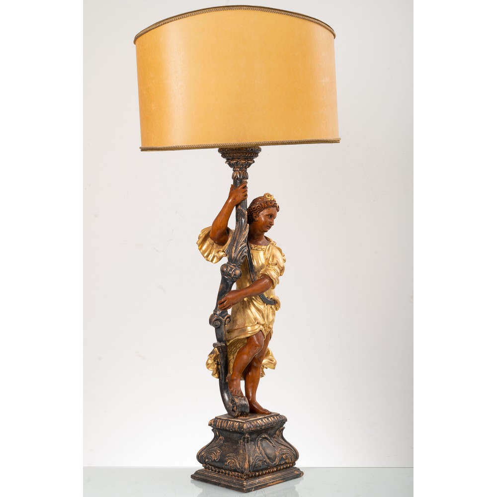 Lume in resina laccata e dorata raffigurante "Figura neoclassica" con ventola.
