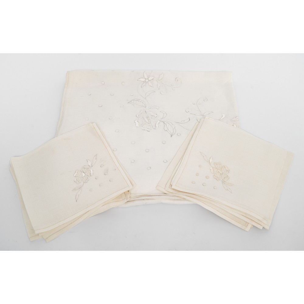TOVAGLIA rettangolare con dodici tovaglioli in lino nei toni del bianco con ricami a mano.