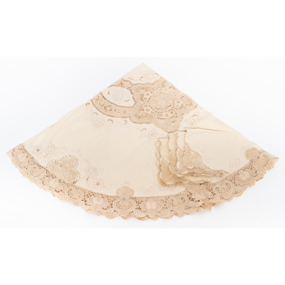 TOVAGLIA circolare e otto tovaglioli in tessuto di lino con ricami a mano.