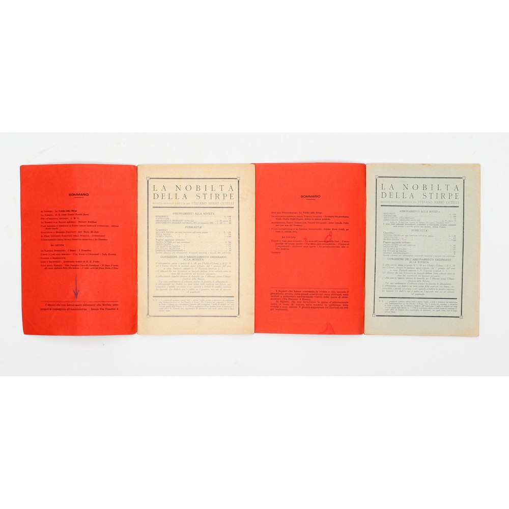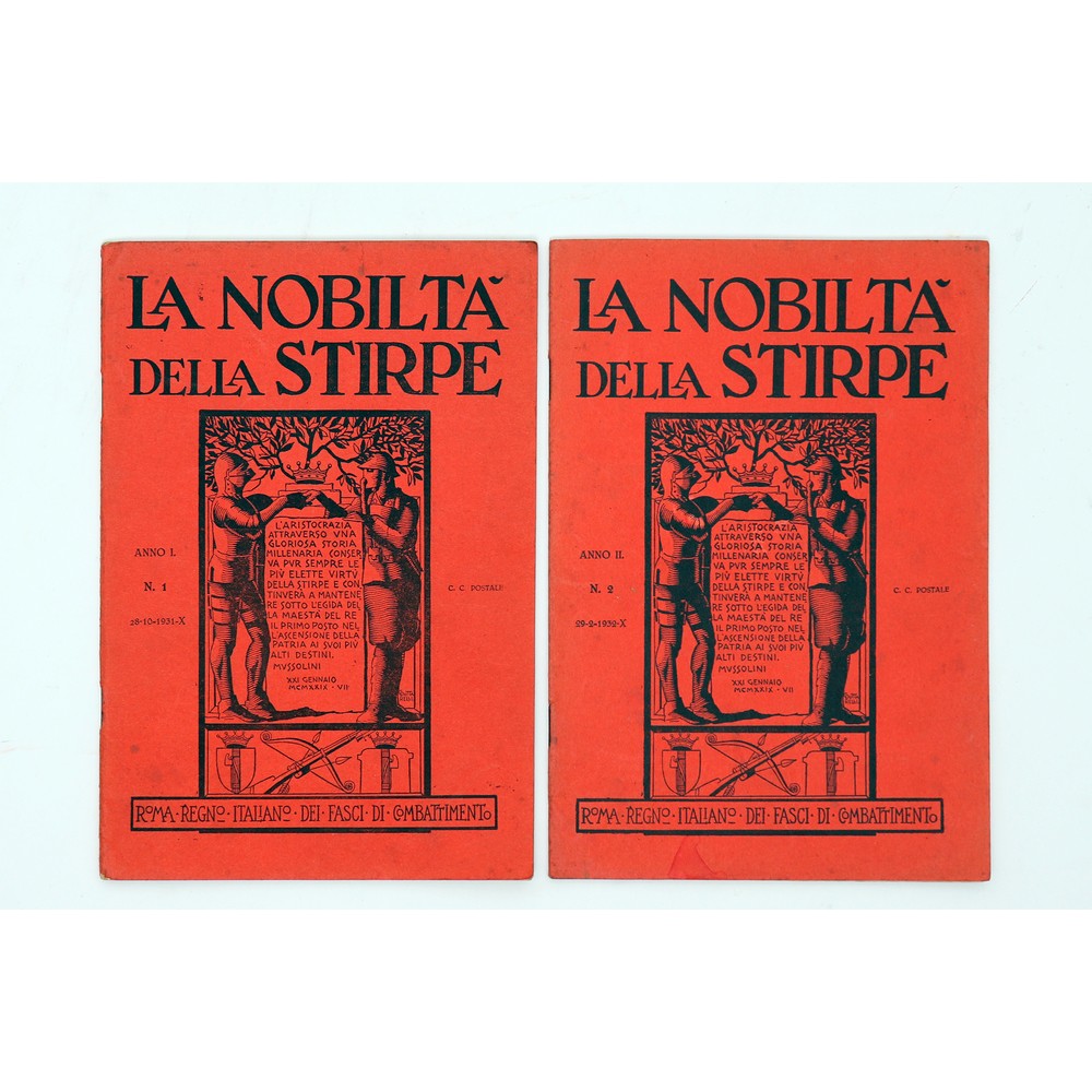 DUE NUMERI DELLA RIVISTA DEL PERIODO FASCISTA: LA NOBILTA’ DELLA STIRPE. RIVISTA MENSILE DIRETTA DA STEFANO MARIO CUTELLI, ed. Roma, 1931 – 1932. Anno I n. 1 e Anno II n. 2. Per i Tipi dei Fasci di Combattimento. In 8°. Brossure editoriali figurate. In ottime condizioni. Pp. 36, (2); 133 – 160, (2).