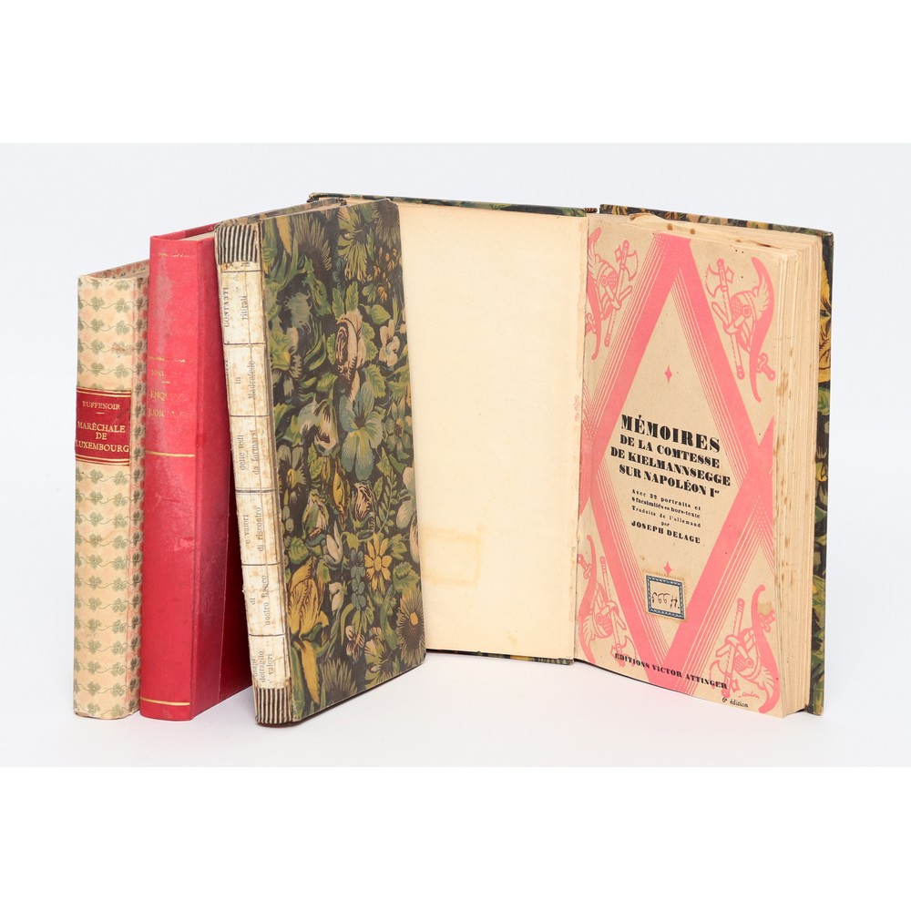 QUATTRO VOLUMI DEL XIX E XX SECOLO, DI ARGOMENTO STORICO, IN LINGUA FRANCESE: 1) MEMOIRES DE LA COMTESSE DE KIELMANNSEGGE SUR NAPOLEON 1er, D'APRÈS LE MANUSCRIT ORIGINAL DES ARCHIVES DU COMTE GUERRINO ZU LYNAR, TRADUITS DE L'ALLEMAND PAR JOSEPH DELAGE - TOMES I et II, ed. Paris – Neuchatel, Editions Victor Attinger, 1928. 2 volumi in 8°. Legature coeve che contiengono le brossure originali. dorsi assenti. Volumi in ottime condizioni interne. Auguste Charlotte, contessa di Kielmannsegge, (Dresda 1777 - Dresda 1863), di nobiltà sassone, alleata della Francia, grazie alla duchessa di Curlandia fu presentata a Napoleone e alla corte imperiale, e dal 1809 divenne membro della corte imperiale e un agente de servizi segreti fedelissima all'imperatore. Pp. 207; 214 con 32 ritratti e 8 facsimili fuori testo. 2) Hippolyte Buffenoir LA MARÉCHALE DE LUXEMBOURG (1707-1787). RICORDI, DOCUMENTI, TESTIMONIANZE, ed. Emile-Paul Frères, Éditeurs 1924. 1^ edizione. In 8°. Collana Études sur le Dix-huitième Siècle. Madeleine Angélique Neufville de Villeroy , duchessa di Boufflers e Lussemburgo, (1707 – 1787). In letteratura nota come Marescialla del Lussemburgo. In antiporta ritratto della Marechale. Legatura successiva con titoli in oro entro tassello al dorso. volume in ottime condizioni. Pp. 255.3) Nicolas Sokoloff ENQUETE JUDICIARIE SUR L’ASSASSINAT DE LA FAMILLE IMPERIALE RUSSE, ed. Payot, Paris 1924. In 8°. Legatura coeva in mezza tela rossa con piatti cartonati rigidi. Volume in ottime condizioni. Pp. 239, (10).