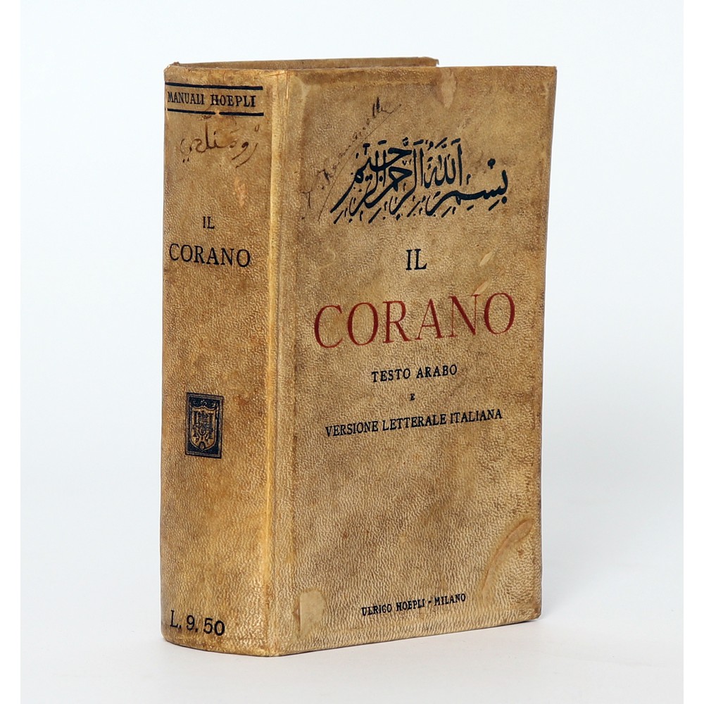 Aquilio Fracassi IL CORANO, ed. Ulrico Hoepli 1914. In 16°. Legatura editoriale in piena pergamena rigida. Testo arabo e versione letterale italiana. In buone condizioni. pp. 359, (6).