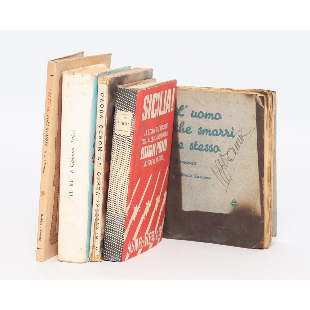 CINQUE VOLUMI DI VARIA: 1) ARETUSA. VOCI REMOTE DI PIETRO VARVARO, ed. Firenze, G. Barbera 1949. In 8°. Brossura editoriale con ali. Volume in eccellenti condizioni. Pagine ancora intonse. Pp. 81. 2) Hugh Pound SICILIA, ed. Longanesi, Milano 1964. Legatura editoriale in piena tela rigida con sopracoperta figurata. In 8°. Volume in ottime condizioni. Pp. 356, (12). 3) Giovanni Artieri IL RE. COLLOQUI CON UMBERTO II, ed. Il Borghese, Milano 1959. In 8°. Legatura editoriale in piena tela rigida con sopracoperta editoriale figurata. Contiene 'Premessa di S.M. Umberto II' in tasca a inizio volume. Fioriture ai tagli ma pagine pulite e ben tenute. Pp. 430. 4) W. A. Spicer VERSO UN MONDO NUOVO, ed. L’Araldo della Verità, Firenze 1946. In 8°. Brossura editoriale illustrata. Pp. 95. 5) Goffredo Vazzana L’UOMO CHE SMARRI’ SE’ STESSO, ed. Ceprano, A. Rosa 1937 – XVI. Brossura editoriale con sporcizie superficiali. Tagli marginosi. In buone condizioni. Pp. 177.